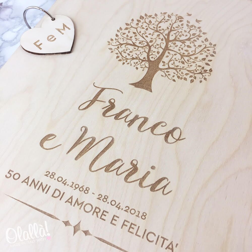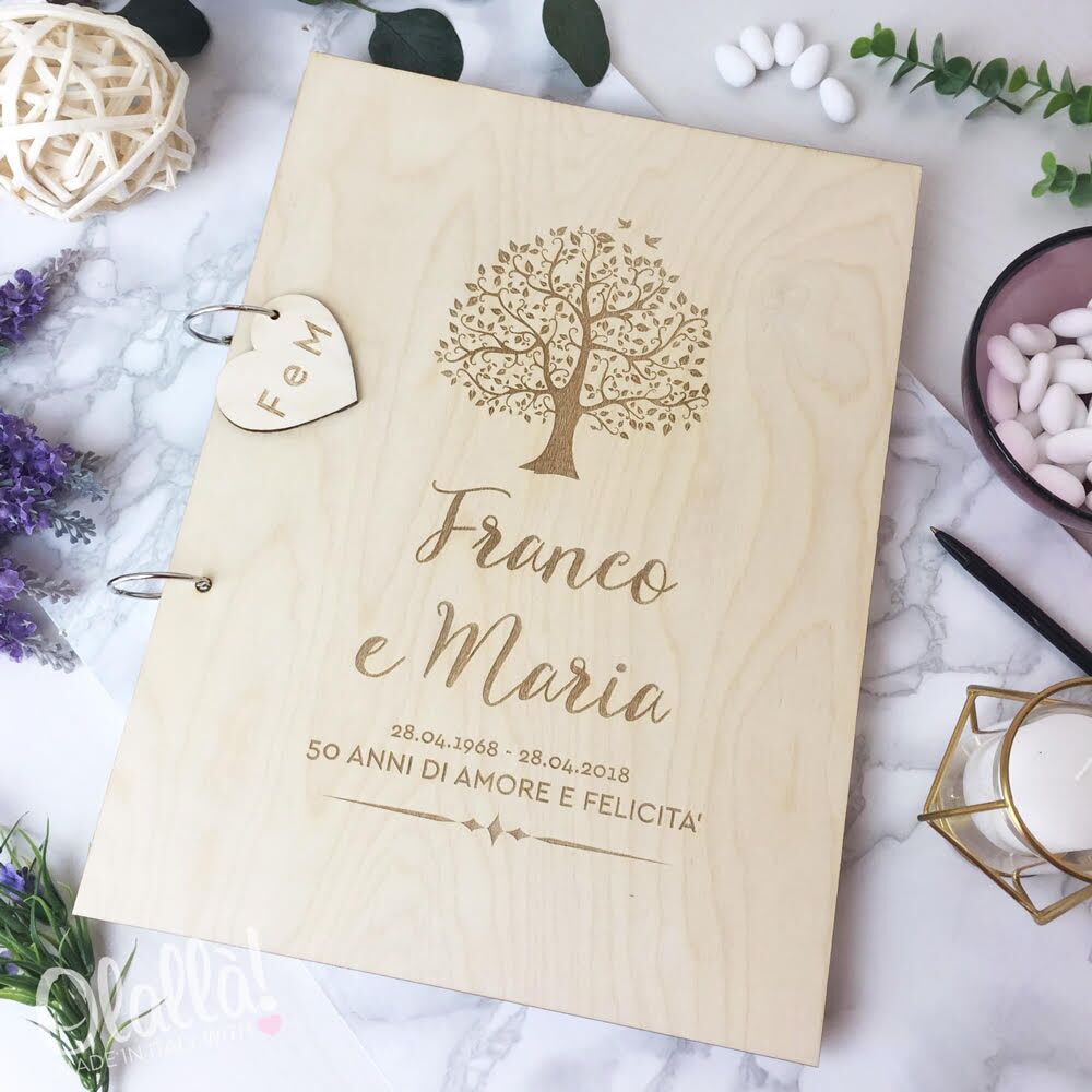 Meraviglioso guestbook in legno personalizzato con l’albero della vita, un cuoricino con le iniziali, i nomi della coppia e una dedica, ideale come regalo per l’Anniversario delle Nozze d’Oro. Riempito dei messaggi ed auguri speciali scritti a mano da amici, parenti ed altri invitati, sarà un modo splendido per permettere alla vostra coppia del cuore di conservare per sempre uno speciale ricordo di 50 anni di matrimonio.