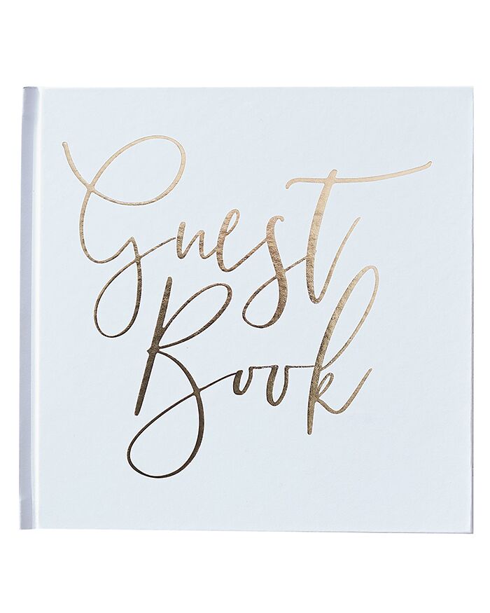 Guestbook in cartoncino rigido bianco, con scritta in oro laminato.