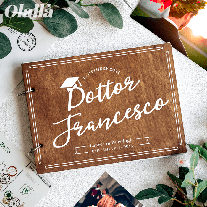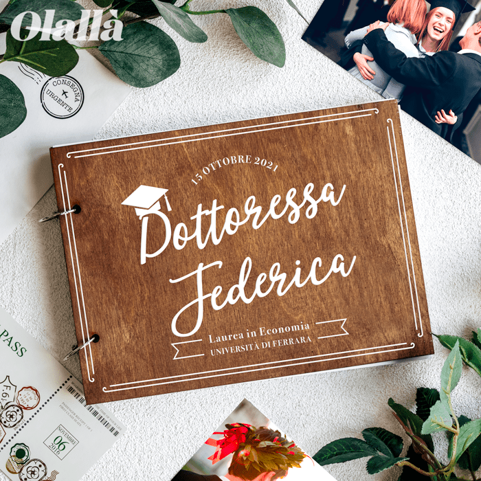Cerchi un album dove i tuoi amici e parenti possano lasciarti una dedica o un augurio nel giorno della tua laurea? Il Guestbook personalizzato è quello che fa per te: 50 pagine bianche pronte ad essere riempite con firme, disegni, polaroid e dediche per ricordare questo traguardo importante. Puoi personalizzare la copertina in legno di noce con il tuo nome e la data della tua laurea, oltre che con il nome dell’università e della facoltà. Il guestbook è il dettaglio che renderà davvero indimenticabile la tua festa di laurea.