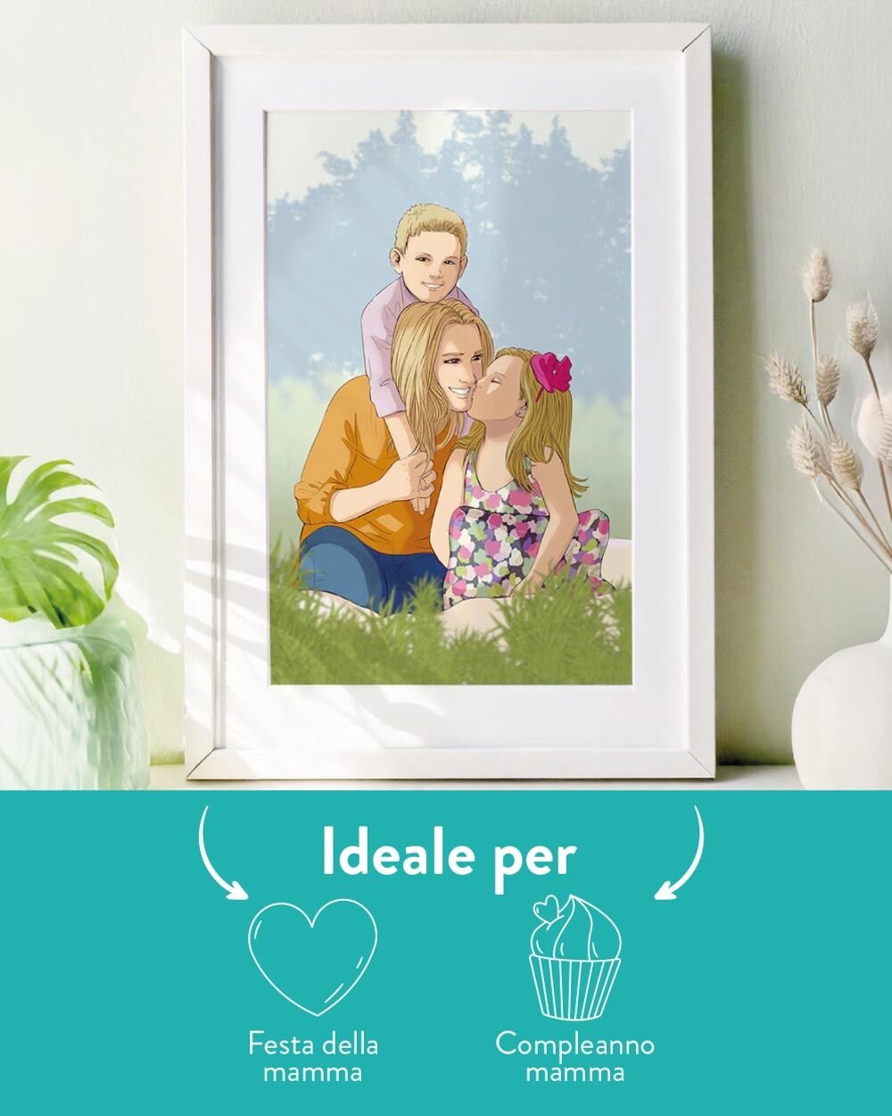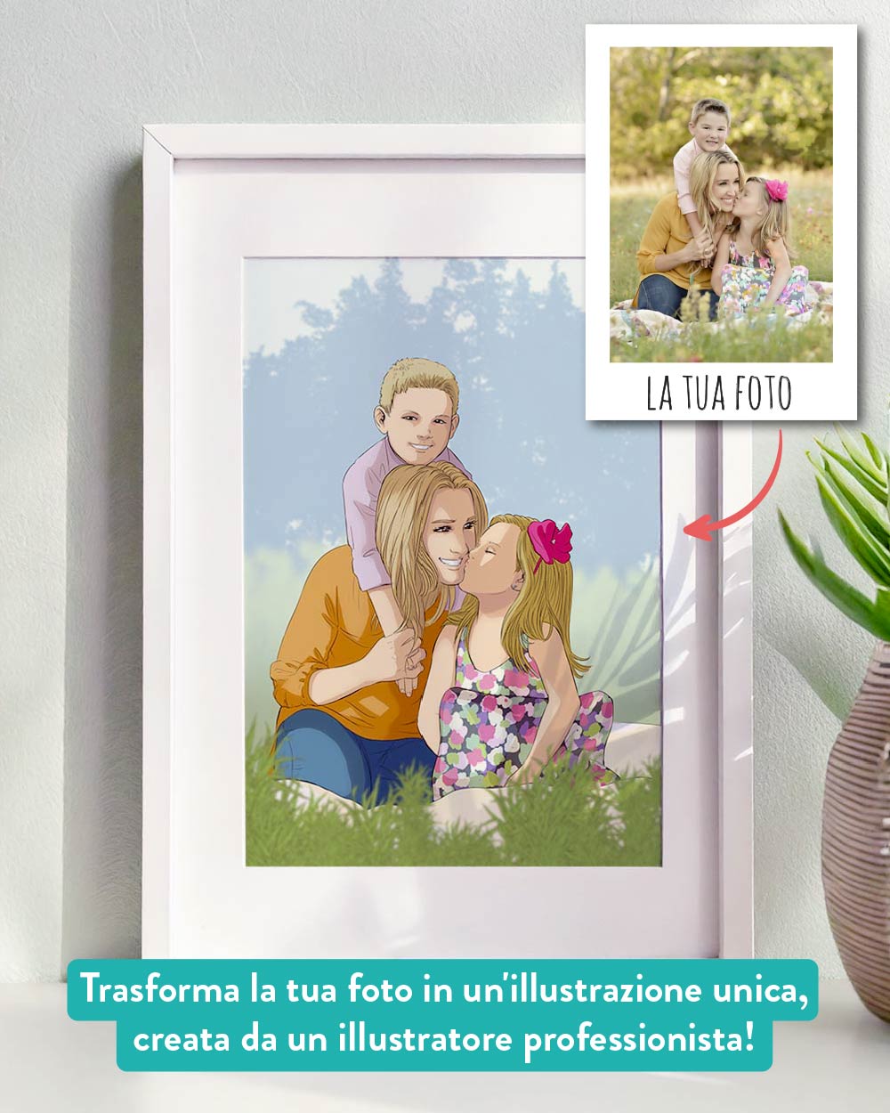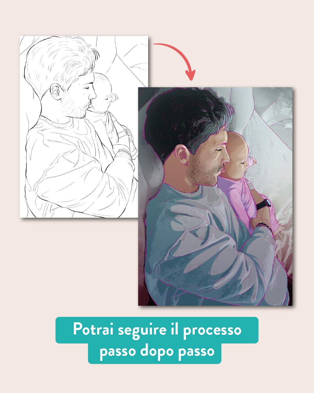 Ogni ritratto viene realizzato a partire dalla tua foto: uno scatto spontaneo, un abbraccio pieno d’amore, un momento condiviso… qualunque sia la tua immagine del cuore, noi la trasformiamo in una meravigliosa illustrazione digitale in stile fumetto, curata in ogni dettaglio. Hai anche la possibilità di aggiungere una dedica personalizzata sotto il disegno, con una frase speciale, il vostro nome o una data importante. Scegli il formato dell’illustrazione e, se lo desideri, aggiungi una cornice per un regalo davvero completo.