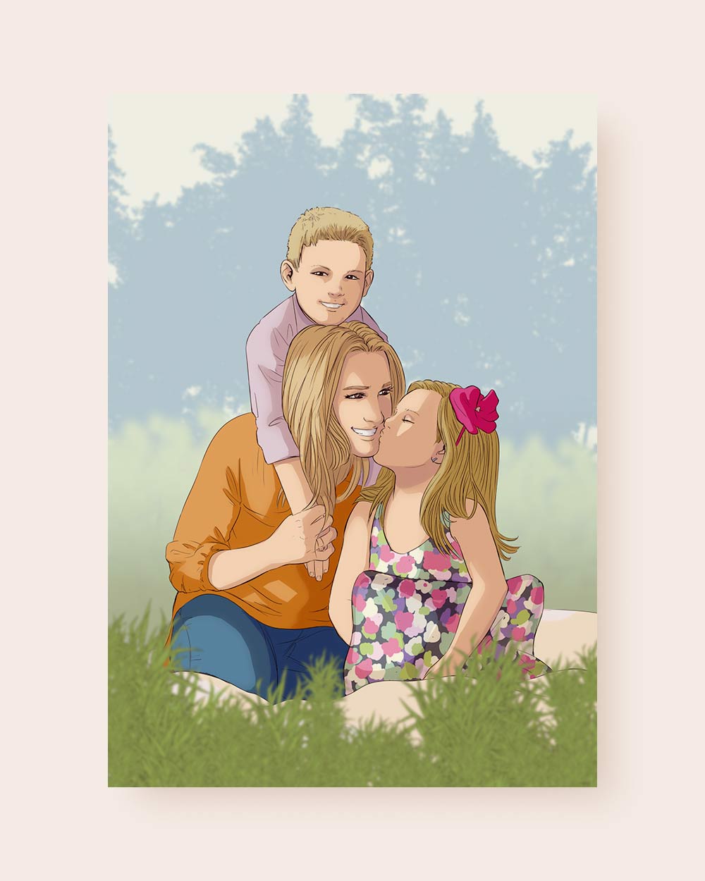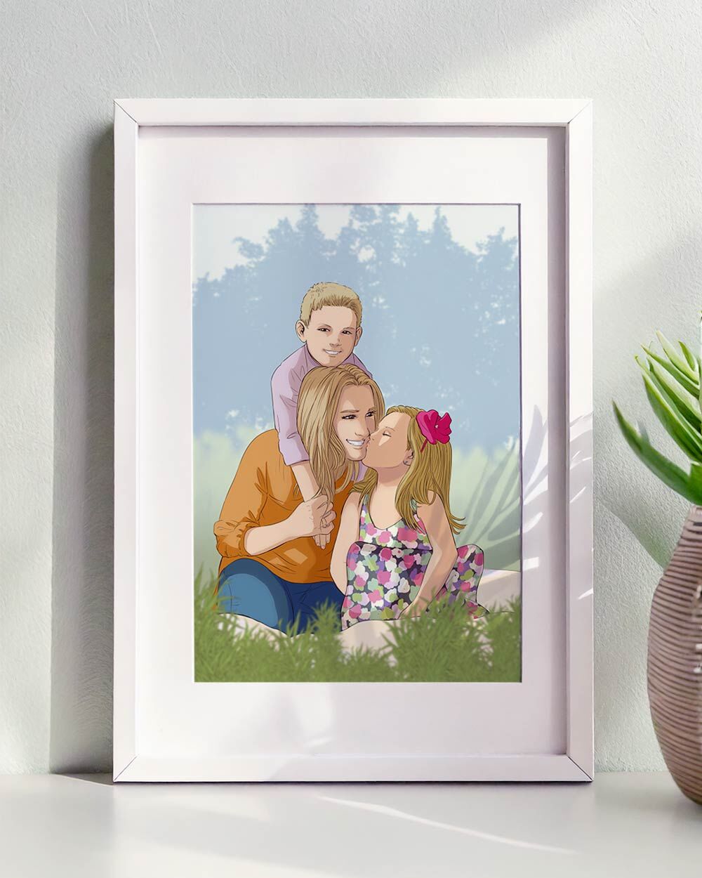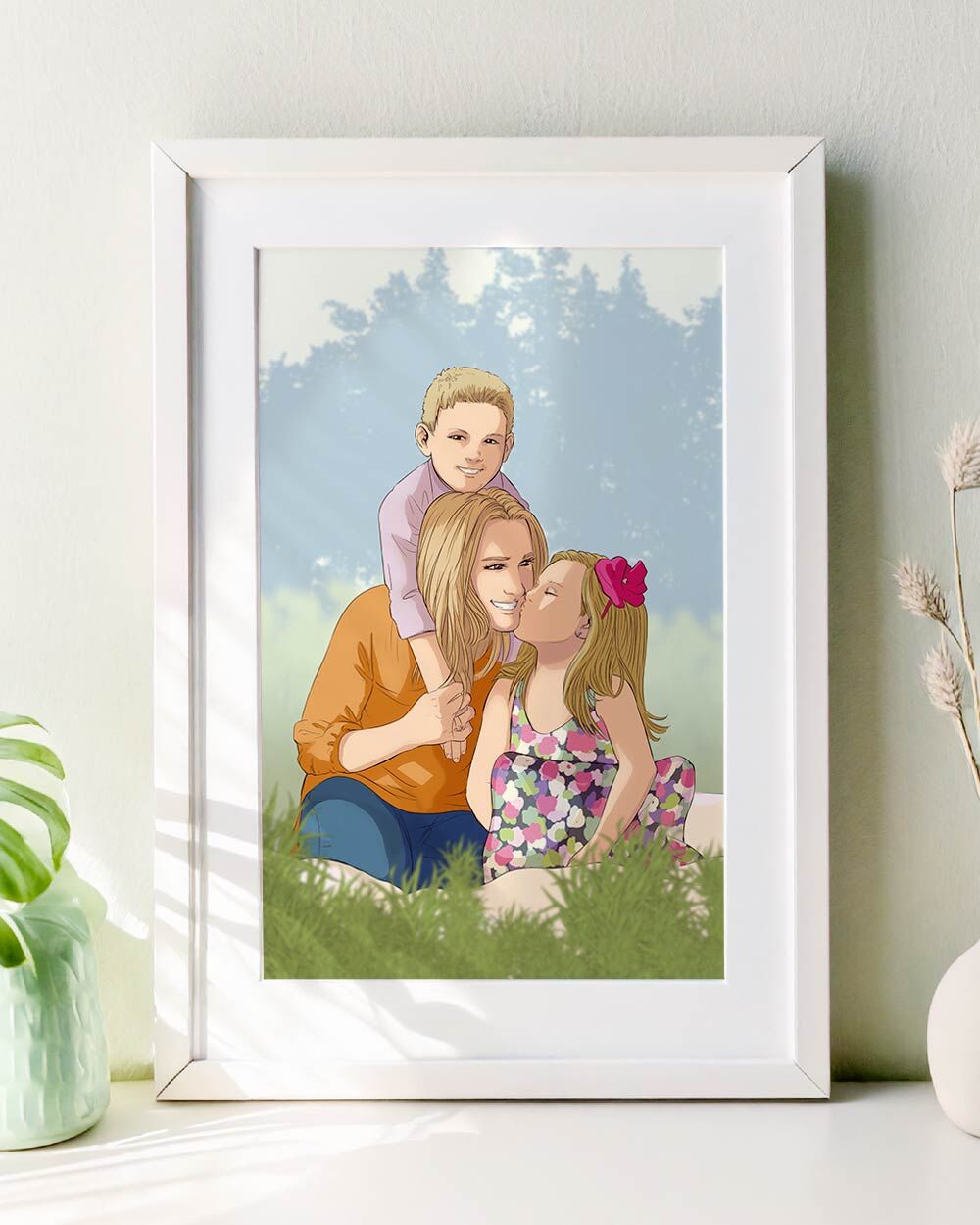 Ogni ritratto viene realizzato a partire dalla tua foto: uno scatto spontaneo, un abbraccio pieno d’amore, un momento condiviso… qualunque sia la tua immagine del cuore, noi la trasformiamo in una meravigliosa illustrazione digitale in stile fumetto, curata in ogni dettaglio. Hai anche la possibilità di aggiungere una dedica personalizzata sotto il disegno, con una frase speciale, il vostro nome o una data importante. Scegli il formato dell’illustrazione e, se lo desideri, aggiungi una cornice per un regalo davvero completo.