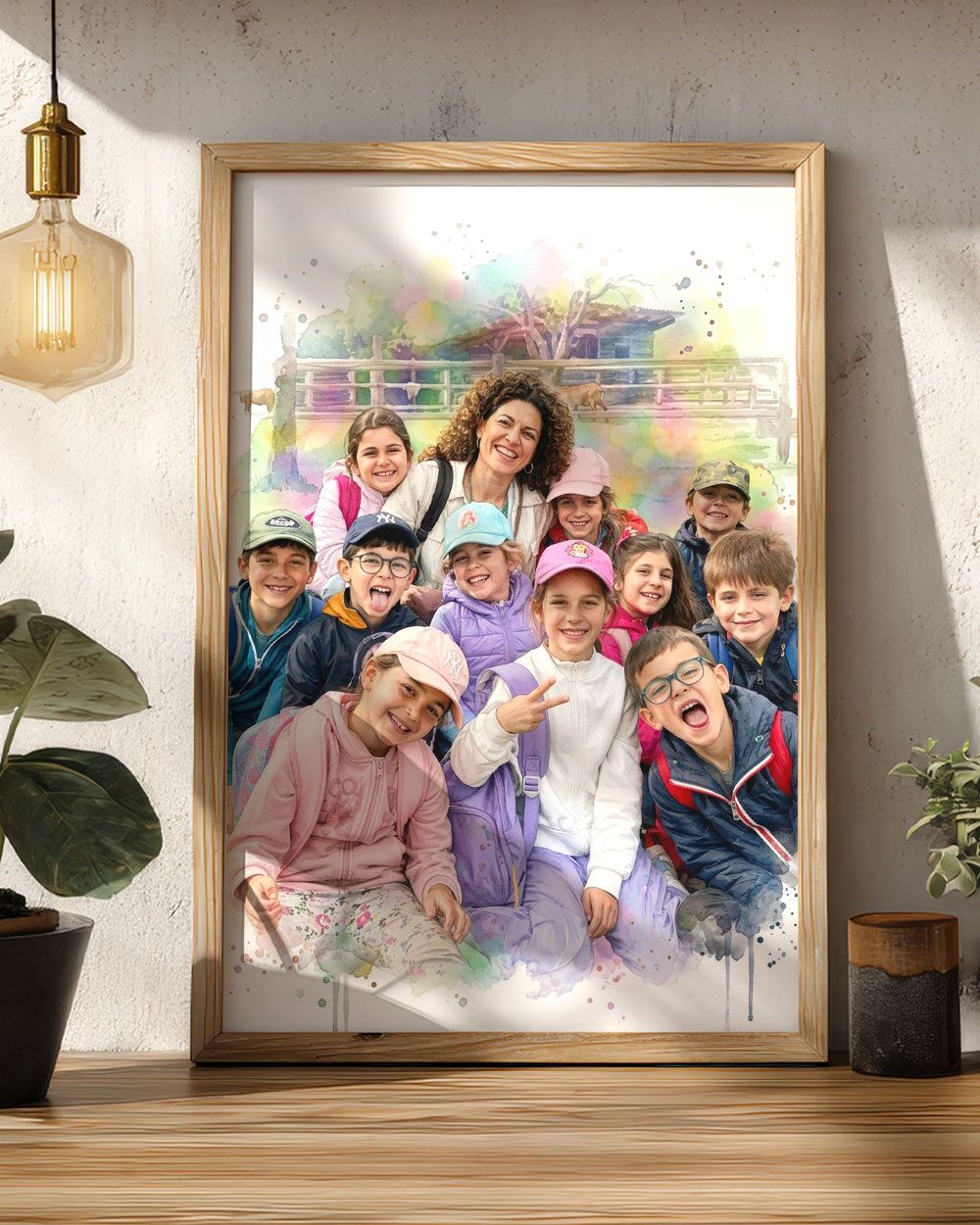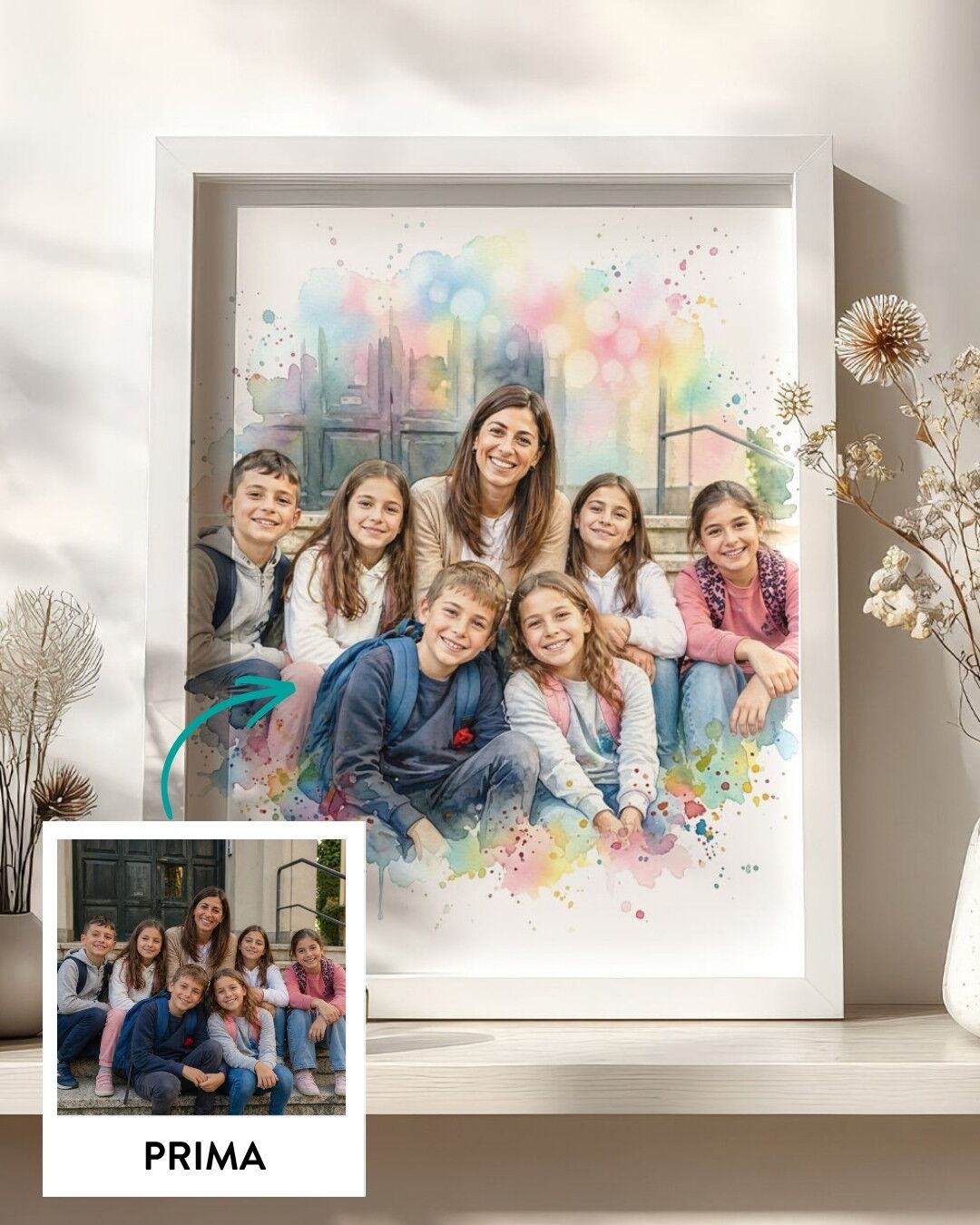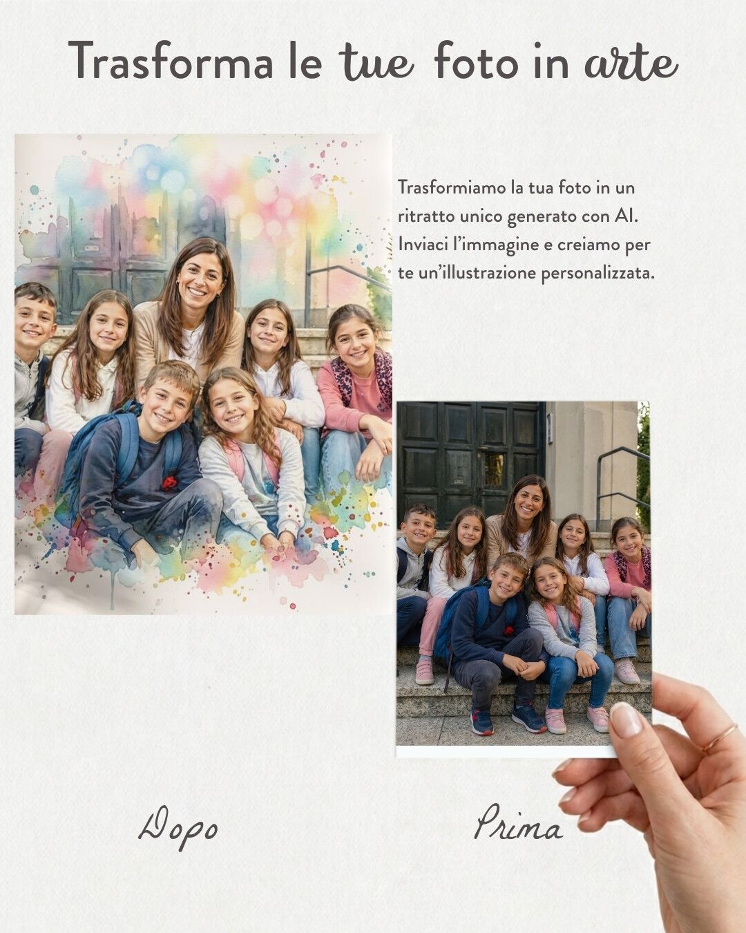 L’illustrazione acquerello colorata parte da una tua foto — uno scatto spontaneo, un ritratto, un momento di classe — e lo trasforma in qualcosa di completamente diverso: i colori diventano vivaci e luminosi, le linee si fanno morbide, l’intera scena acquista una dimensione poetica e delicata. Non è una stampa qualunque. È un’opera piccola ma vera, che la maestra potrà appendere nello studio, in classe o a casa, e che ogni giorno le ricorderà quanto ha contato per te e per il tuo bambino.