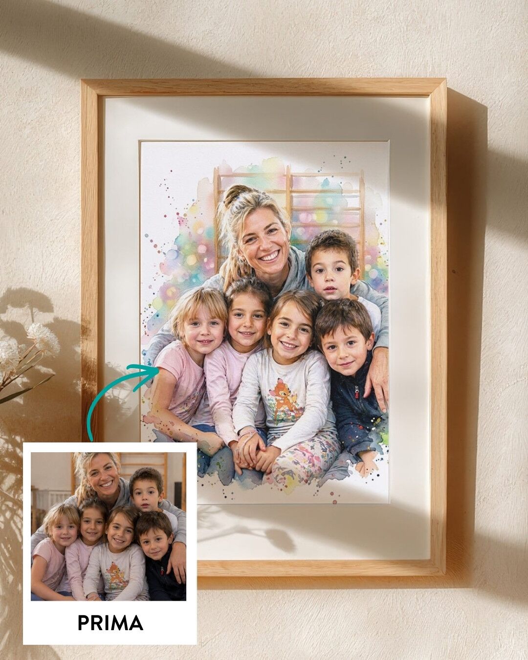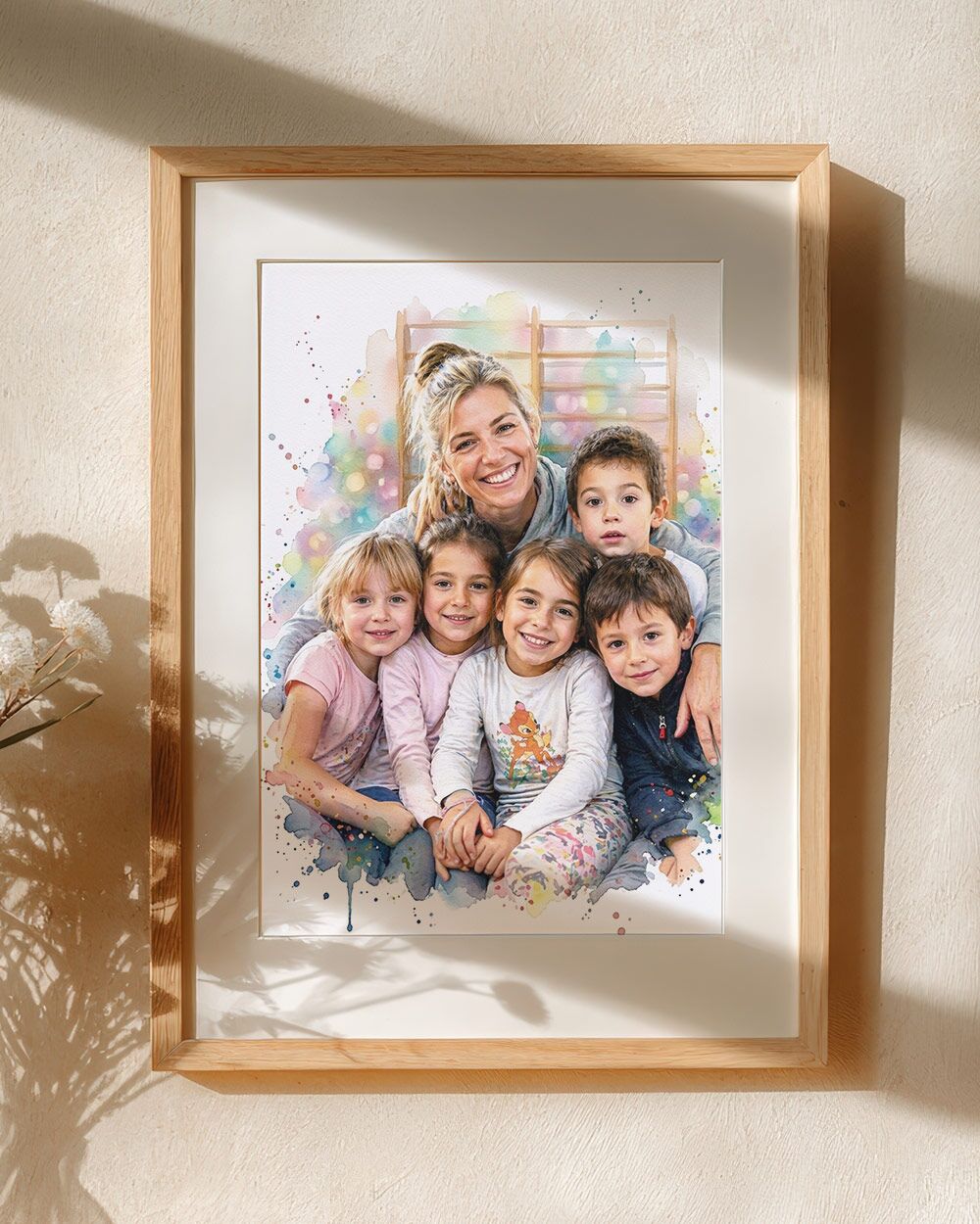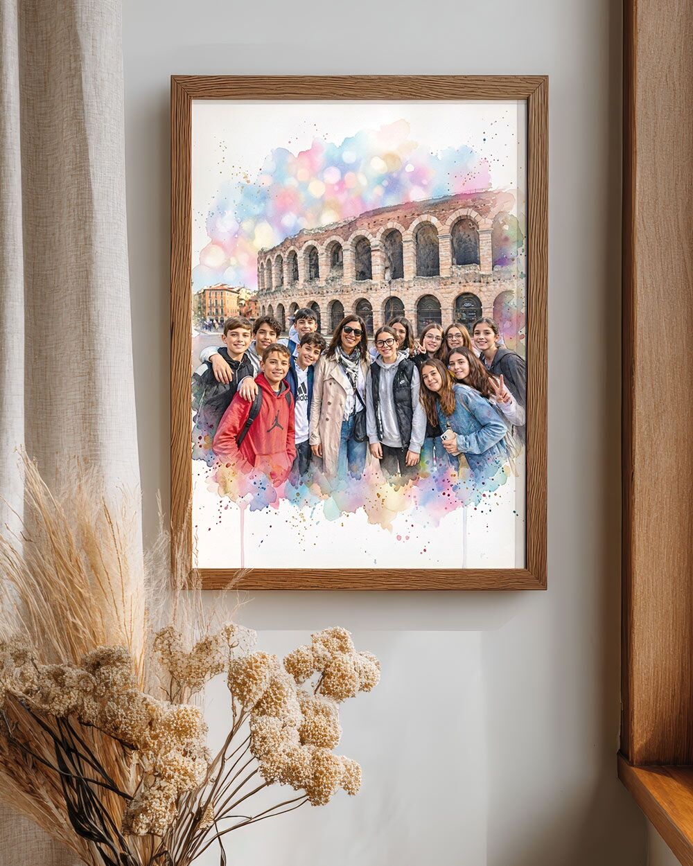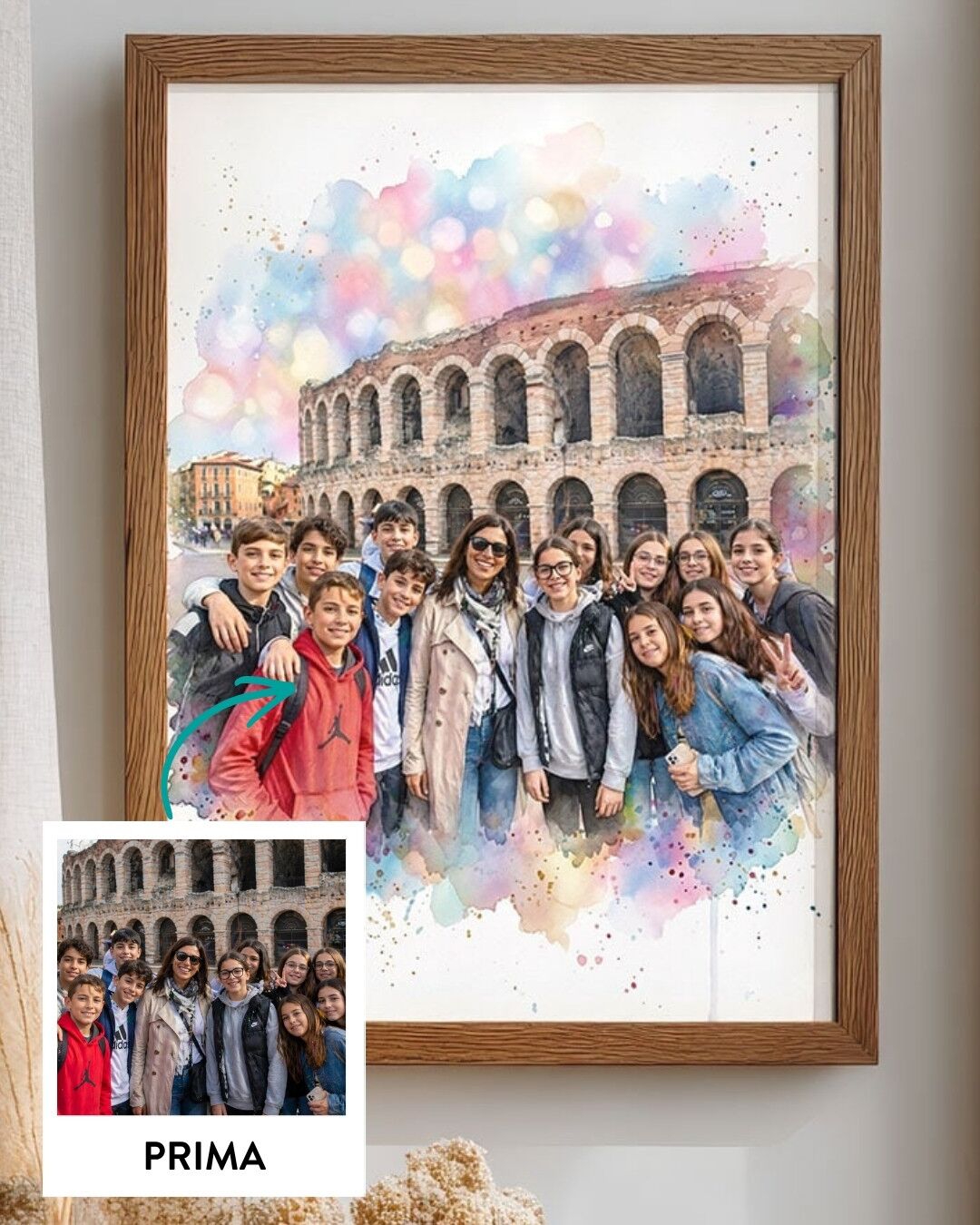 L’illustrazione acquerello colorata parte da una tua foto — uno scatto spontaneo, un ritratto, un momento di classe — e lo trasforma in qualcosa di completamente diverso: i colori diventano vivaci e luminosi, le linee si fanno morbide, l’intera scena acquista una dimensione poetica e delicata. Non è una stampa qualunque. È un’opera piccola ma vera, che la maestra potrà appendere nello studio, in classe o a casa, e che ogni giorno le ricorderà quanto ha contato per te e per il tuo bambino.