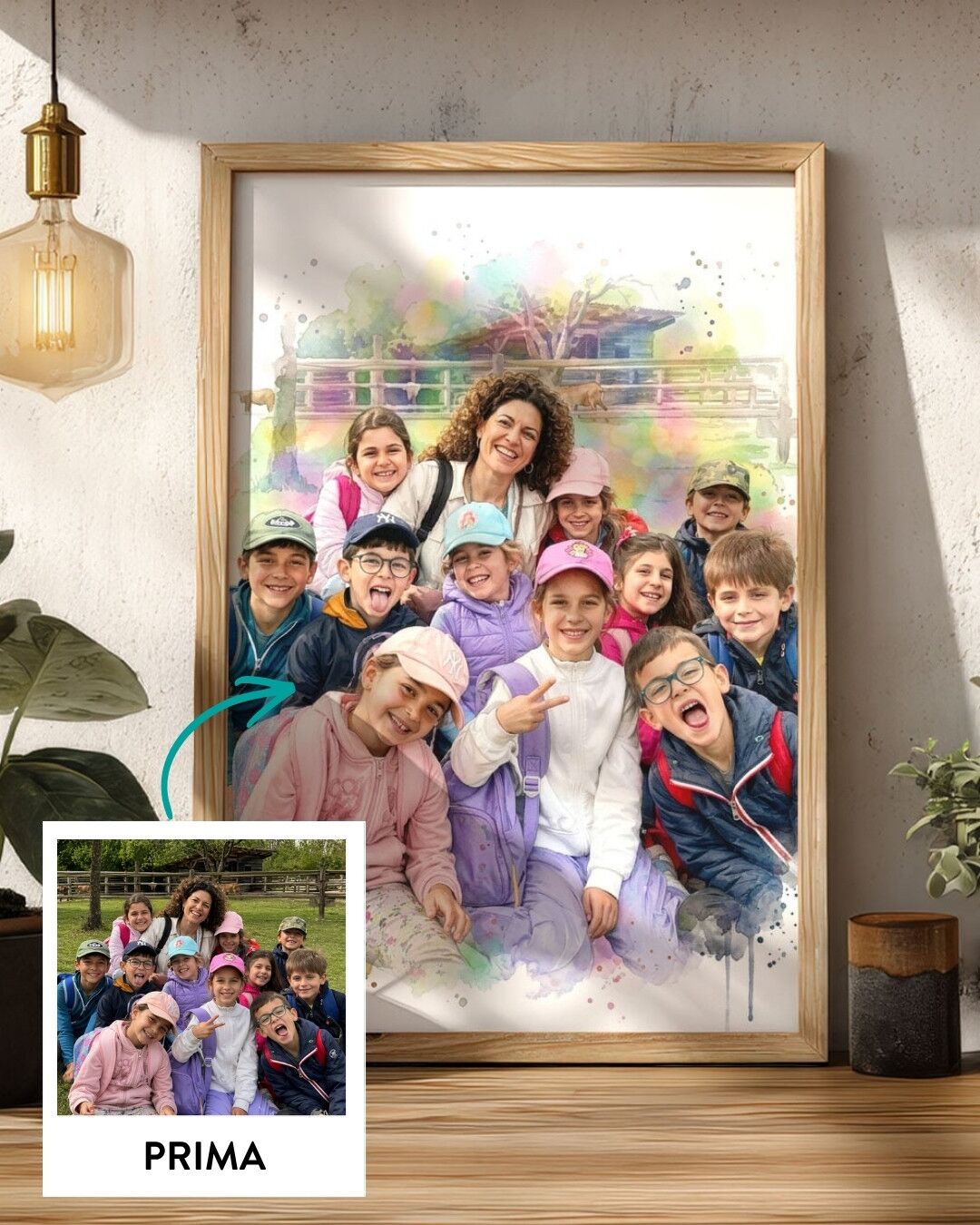 Assolutamente sì — è anzi una delle scelte più amate per i regali collettivi di fine anno. I genitori raccolgono una bella foto della maestra con la classe, la caricano una volta sola, e il risultato è un regalo d’arte unico e condiviso che la maestra conserverà per anni.