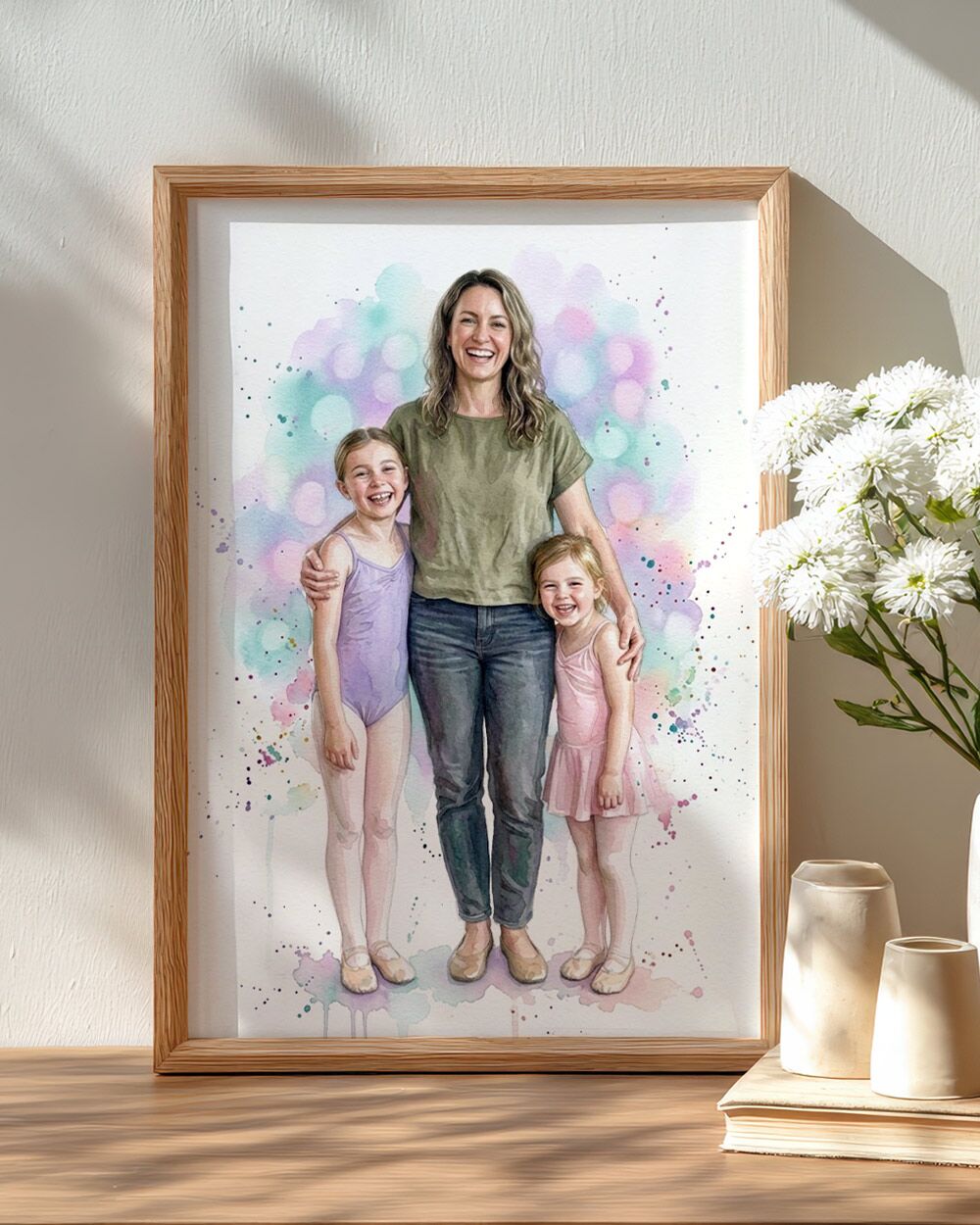 I nostri grafici lavorano ogni illustrazione con attenzione ai dettagli: mantengono i tratti riconoscibili del soggetto — il sorriso, gli occhi, la postura — avvolgendoli in una palette di acquerello luminosa e calda. Il risultato è qualcosa che sembra uscito da un libro illustrato bellissimo: sofisticato, colorato, unico nel suo genere.
