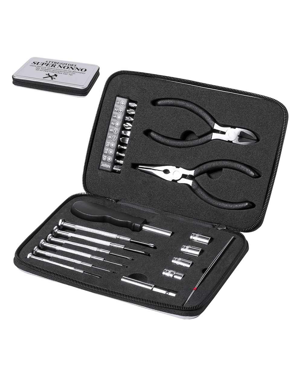 2. 25 Attrezzi Funzionali: ogni attrezzo incluso nel kit è selezionato per la sua funzionalità e qualità. Dalla pinza al cacciavite, ogni strumento è pensato per essere utile in una vasta gamma di situazioni, assicurando che il nonno abbia sempre l’attrezzo giusto a portata di mano.