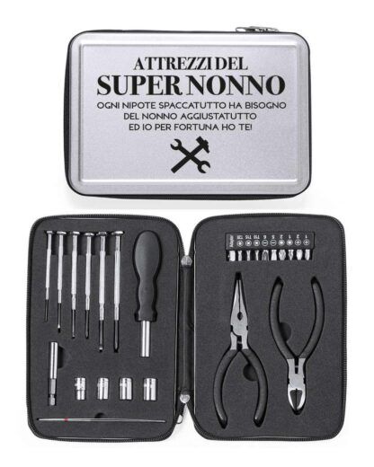Cerchi un regalo che faccia sentire il tuo nonno speciale, apprezzato e valorizzato? Il nostro Kit Attrezzi “Attrezzi del Super Nonno” con Valigetta Set 25 Pezzi Personalizzata con Dedica è l’idea regalo ideale per rendere la Festa dei Nonni davvero memorabile. Questo set non è solo una collezione di attrezzi di alta qualità, ma un gesto d’amore che celebra il nonno tuttofare, sempre pronto ad aggiustare, costruire e migliorare il mondo intorno a lui.