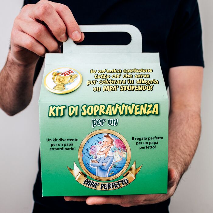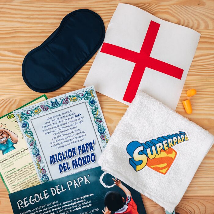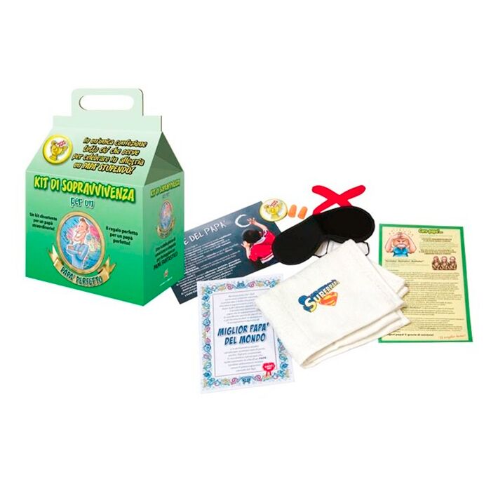 Il kit di sopravvivenza per il papà è un contenitore con all’interno oggetti ironici e divertenti. Aprendo la confezione potrete subito spassarvela e curiosare tra gadget super simpatici. Troverete una mascherina per gli occhi, dei tappi per le orecchie e un grande cerotto per la bocca (non vedo, non sento, non parlo). Nel kit scoprirete poi consigli spiritosi per diventare un papà perfetto, una spilla, un diploma di papà, un asciugamano del Superpapà.