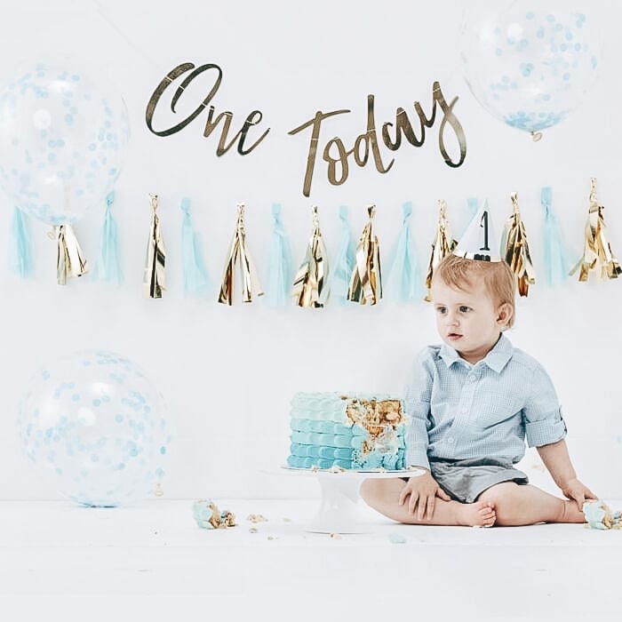 Kit per festa di primo compleanno. Il kit può anche essere usato per il classico servizio fotografico di cake smash le cui simpatiche foto ricorderanno per sempre la festa del suo primo compleanno! Il kit contiene tutto il necessario per organizzare nel migliore dei modi la festa perfetta per il suo primo compleanno: una ghirlanda con scritta One Today, 1 cappellino, una ghirlanda da appendere oro e azzurra e 5 palloni con coriandoli azzurri all’interno.