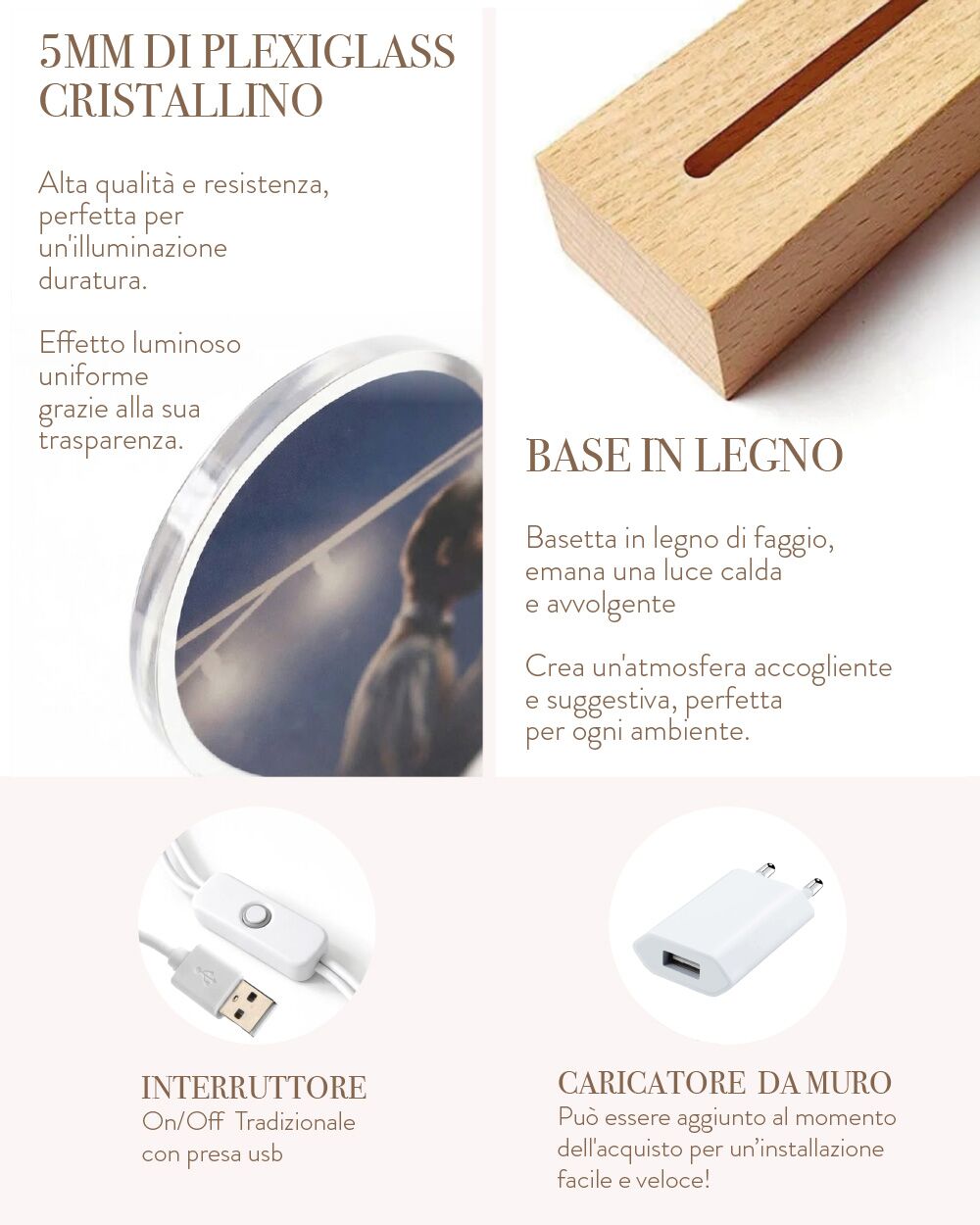 - Personalizza con il cuore: Carica la vostra foto più bella, scrivi le tue due dediche (sopra e sotto) e decidi se aggiungere l’incisione sulla base in legno o l’adattatore USB.