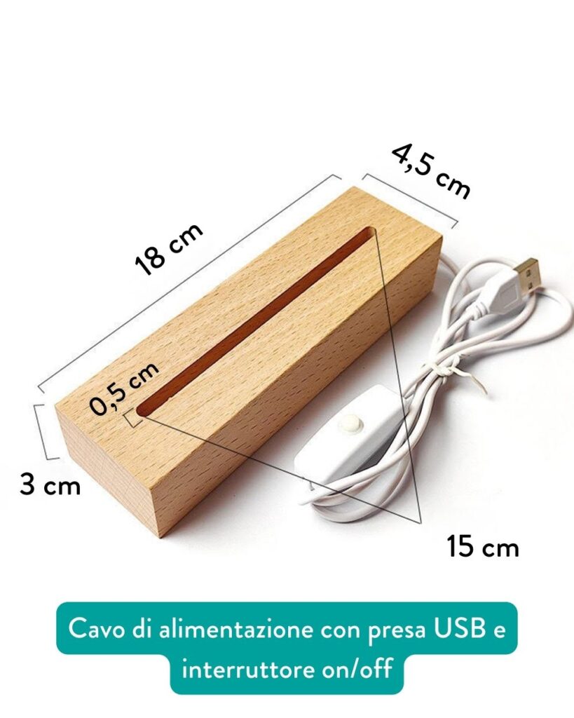 COSA COMPRENDE: lampada a luci led composta da una targhetta in plexiglass stampato e una base in legno.
