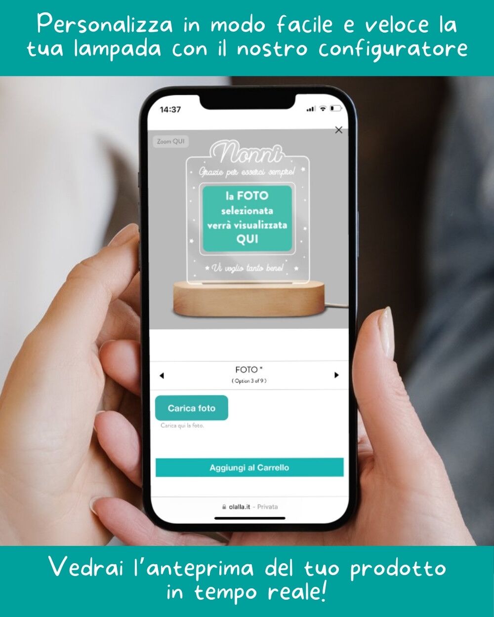 Personalizza la lampada con il nostro configuratore automatico, ti permetterà di vedere la tua lampada prendere forma passo dopo passo! Sarà facile e velocissimo! Un regalo che non solo illumina, ma racconta una storia.