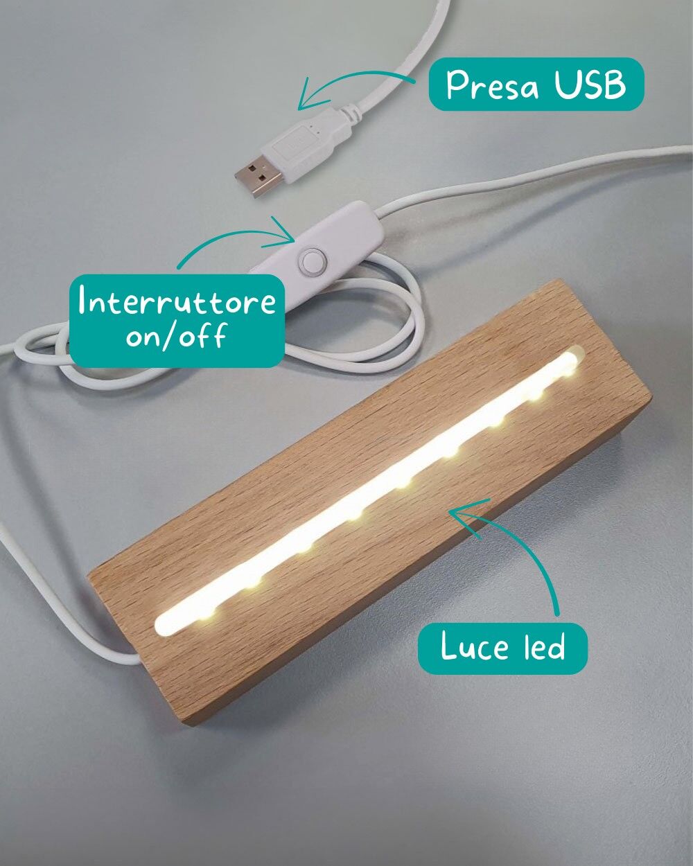 ALIMENTAZIONE: alimentazione USB, compresa nella confezione. Il filo presenta un interruttore on/off e una presa USB per l’alimentazione.