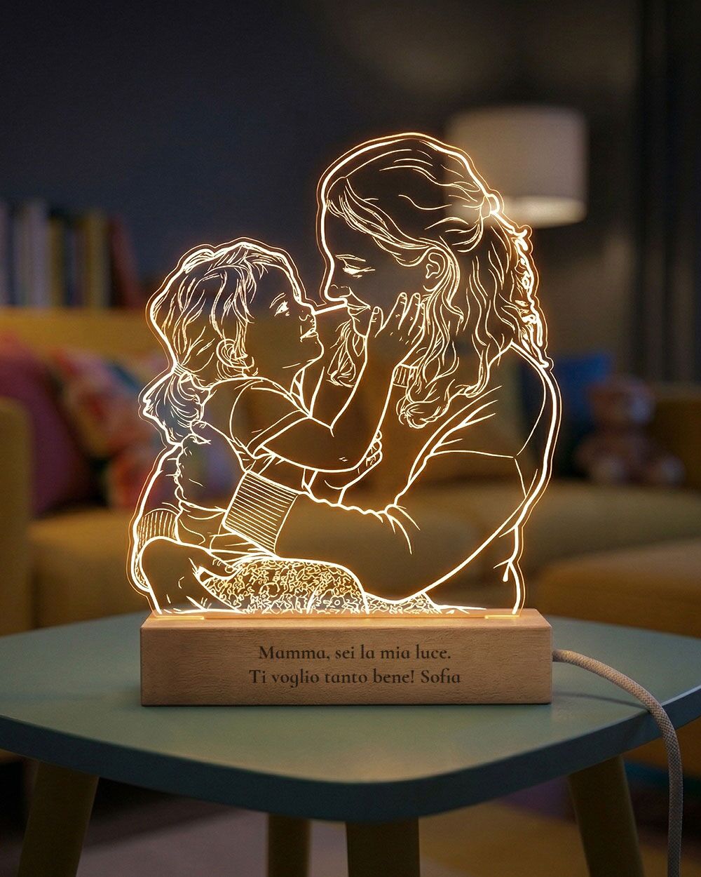 Puoi anche aggiungere una dedica incisa sul legno della base: poche parole scelte con cura che resteranno lì, ogni volta che si accende la luce, a raccontare perché hai scelto proprio quella foto, proprio per quella persona. È un regalo con foto per la mamma o per chiunque ami davvero, con quella firma personale che rende tutto più autentico.