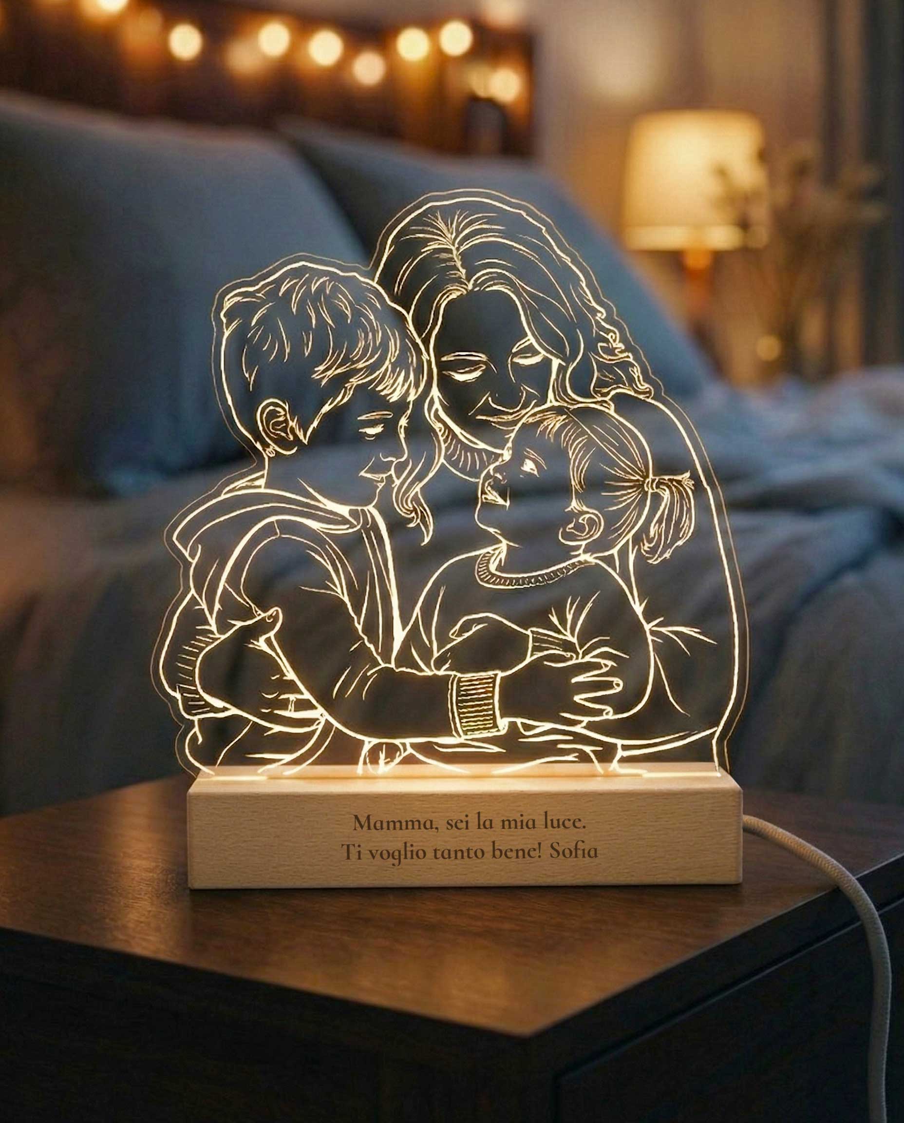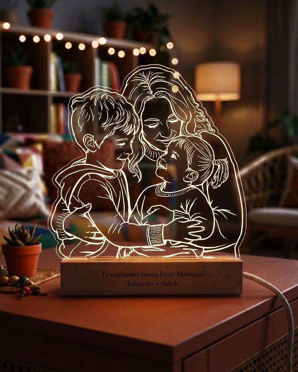 La lampada LED line art è pensata per chi vuole regalare qualcosa di visivamente unico, che unisce arte e affetto. È il regalo per la Festa della Mamma che non ti aspetti: carica la sua foto più bella, o quella con i suoi figli, e aggiungi una dedica incisa nel legno che racconta tutto con poche parole. Ogni volta che la accenderà, si ricorderà di quel gesto.