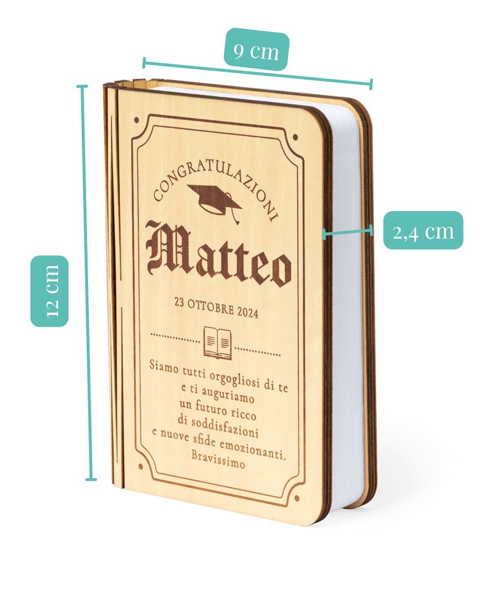 Cerchi un regalo unico e indimenticabile per un neolaureato? La nostra Lampada a Libro Personalizzata con Nome, Data e Dedica è la soluzione perfetta. Questa originale lampada LED a forma di libro è tanto pratica quanto affascinante, combinando design elegante e funzionalità. Realizzata in legno, si apre per rivelare un interno che simula realisticamente i fogli di carta, illuminati da 16 LED luminosi ma delicati.