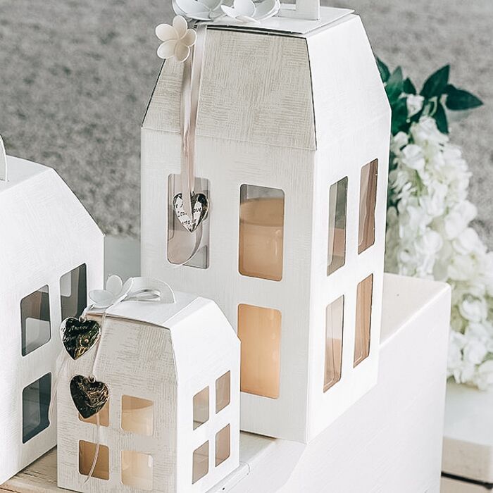 Bellissimo set da 10 scatole a forma di lanternina in cartoncino bianco con finestrelle. Perfette per creare una originalissima bomboniera per il tuo matrimonio e per tutte le tue cerimonie.