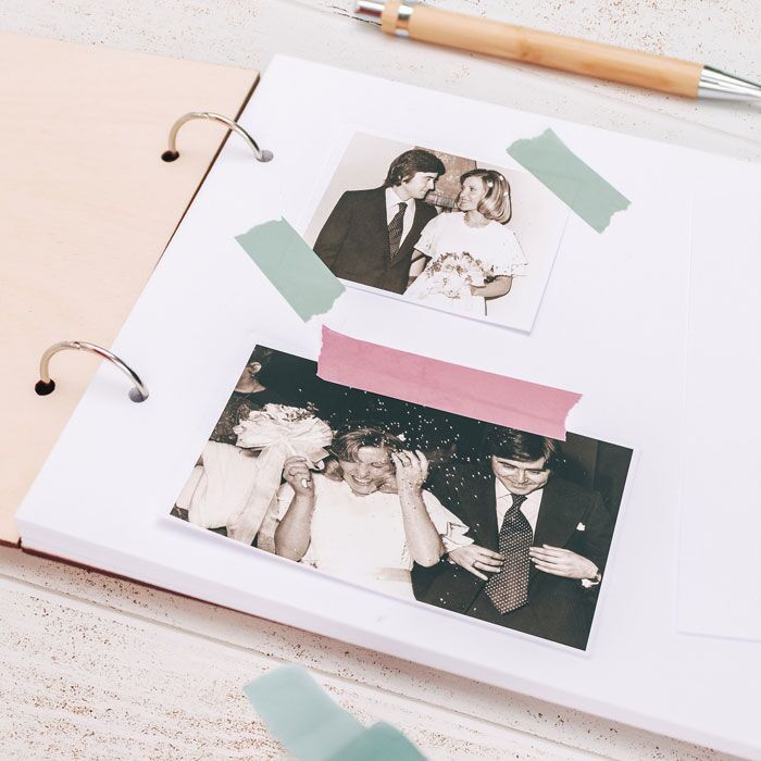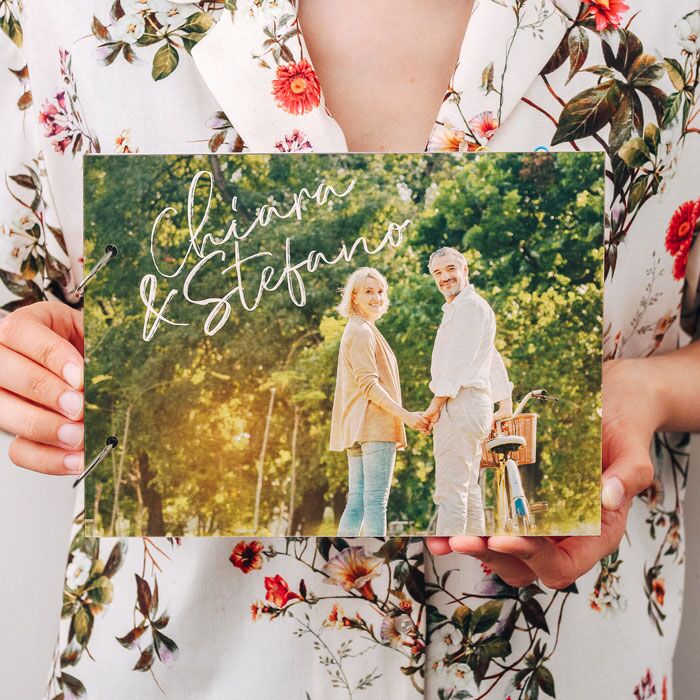 Romantico Album Portafoto o Libro dei Ricordi personalizzato in legno con la vostra foto e i nomi. Questo album sarà un regalo speciale per la coppia che festeggia le nozze d’argento o d’oro e desidera ripercorrere tutti i momenti più belli della loro lunga storia d’amore. Può essere utilizzato anche come album per celebrare un anniversario importante con la persona del cuore.