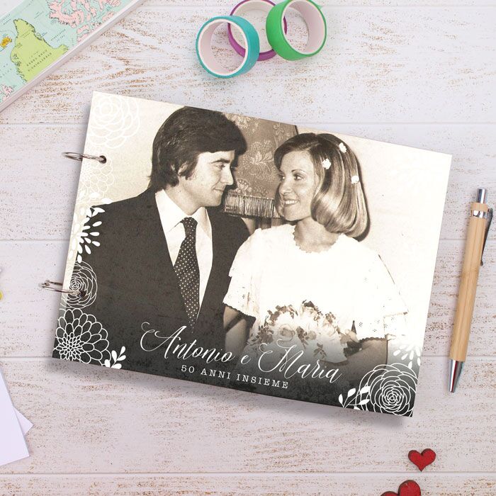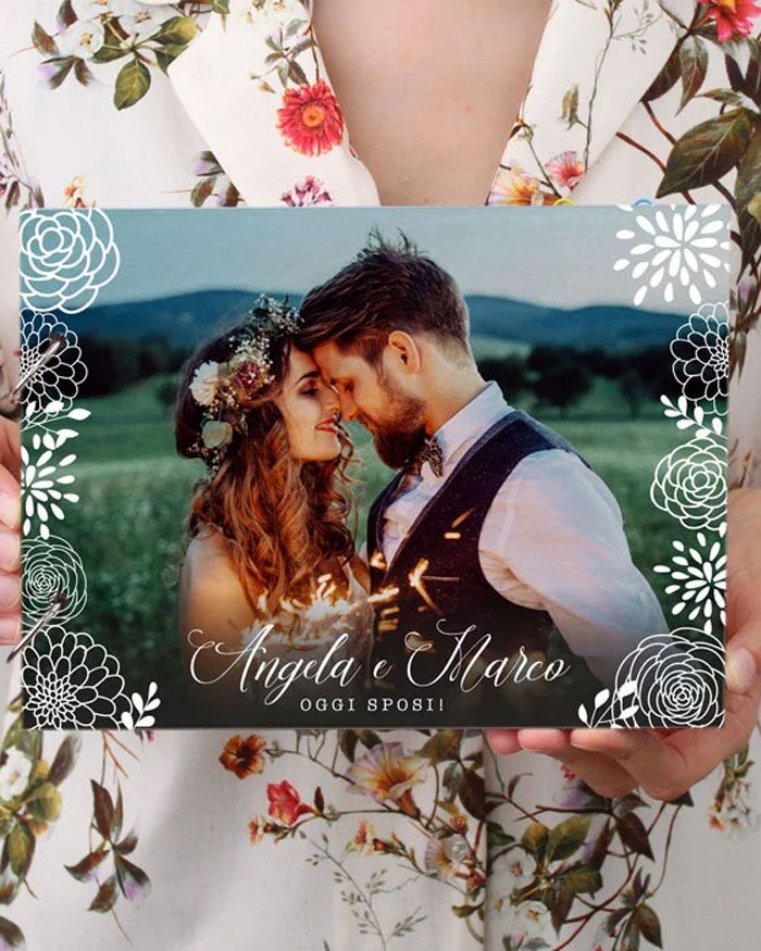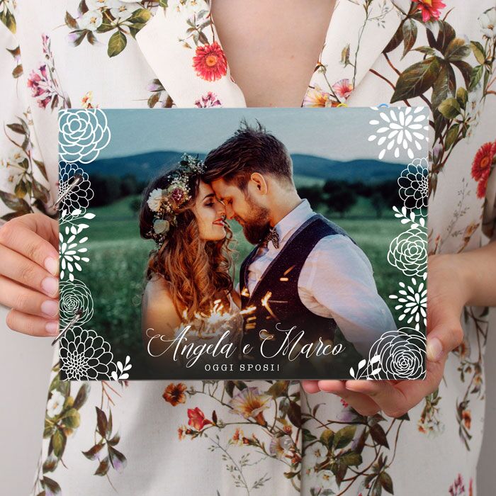 Romantico Album Portafoto o Libro dei Ricordi personalizzato in legno con la vostra foto e i nomi, circondati da una bellissima cornice floreale. Questo album sarà un regalo speciale per la coppia di sposi che si appresta a creare un libro dei ricordi del loro matrimonio, da riempire con foto e dediche! Può essere utilizzato anche come album per celebrare un anniversario importante con la persona del cuore.