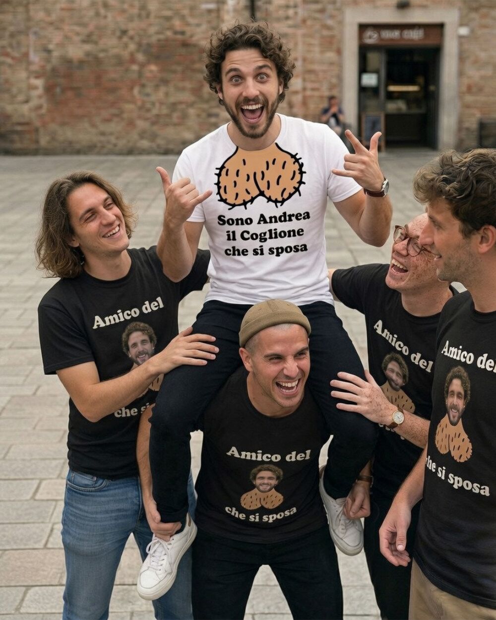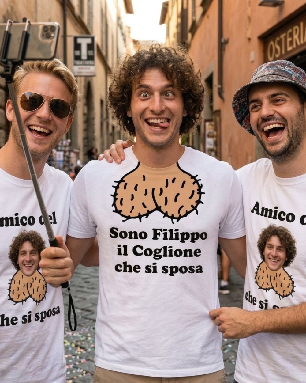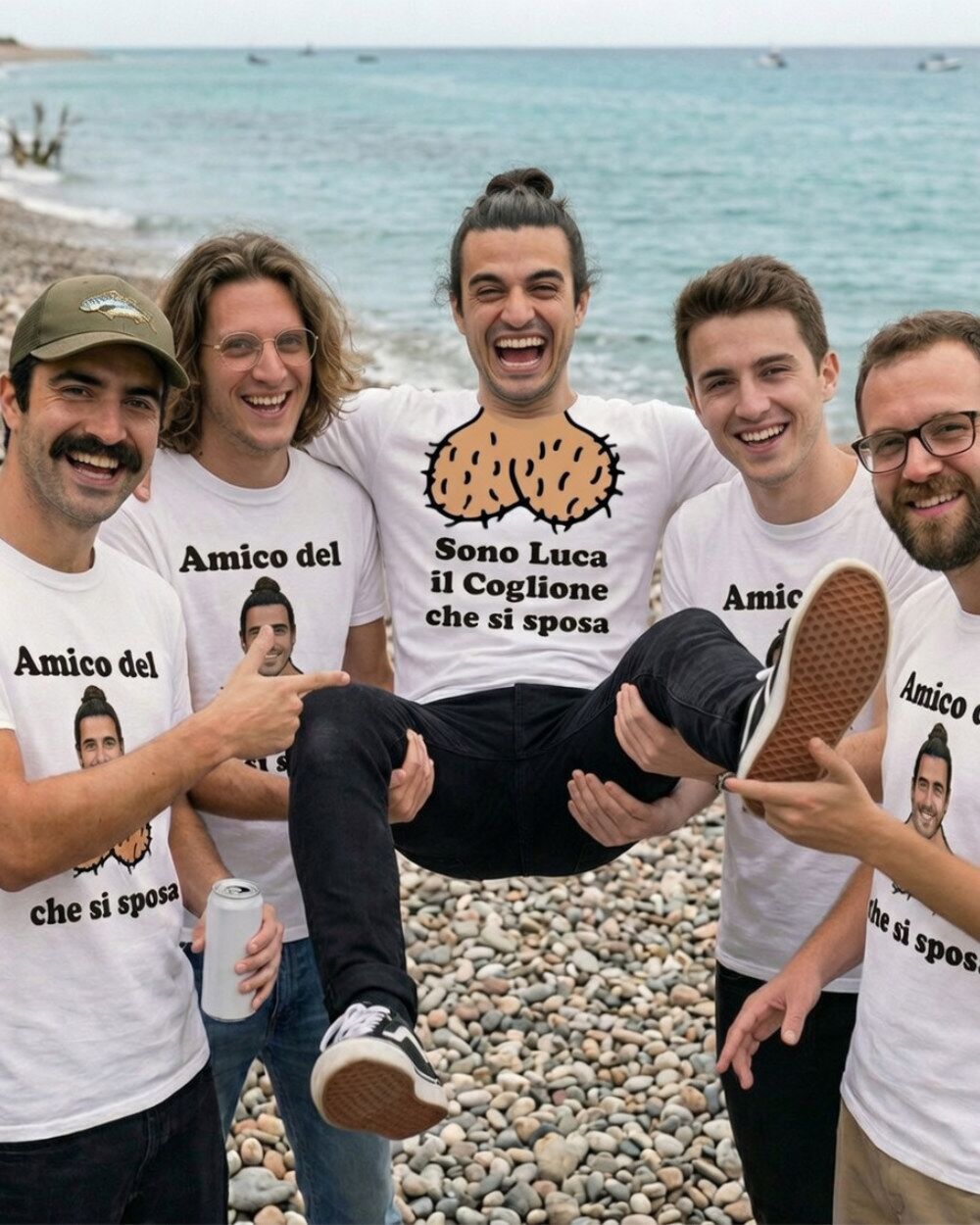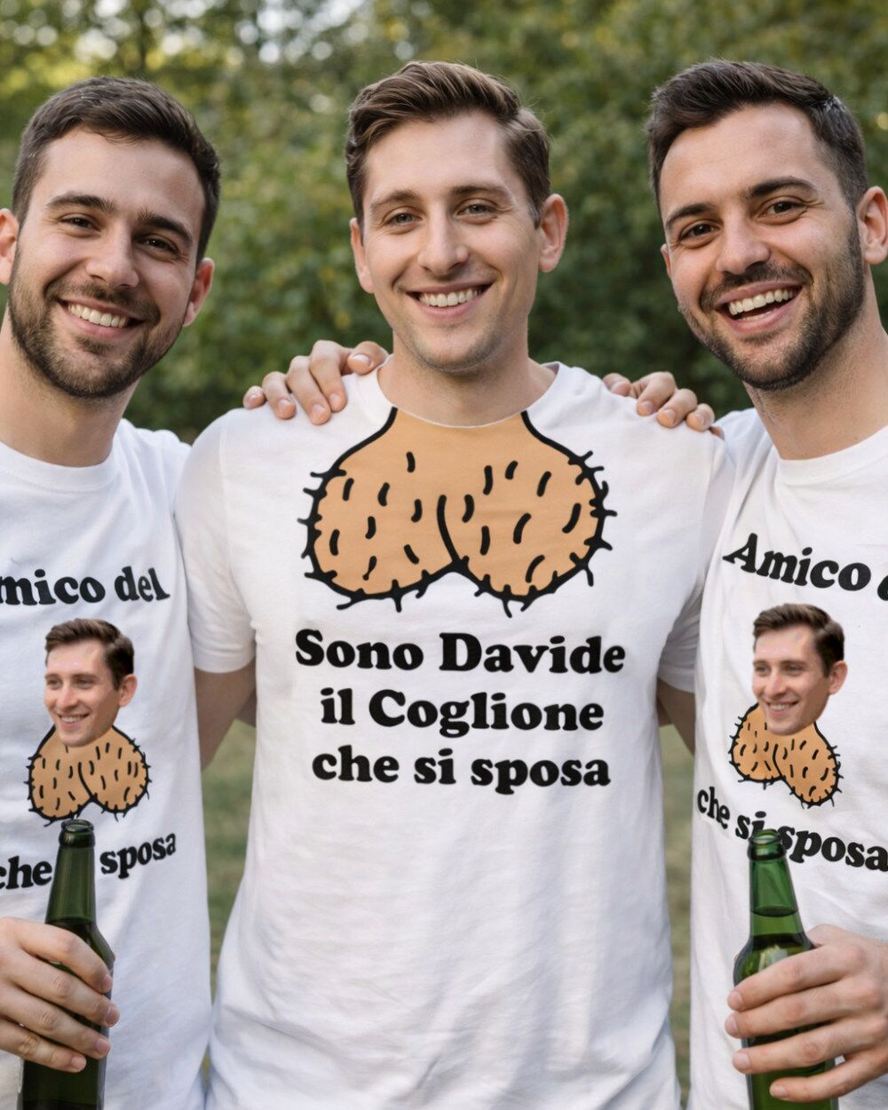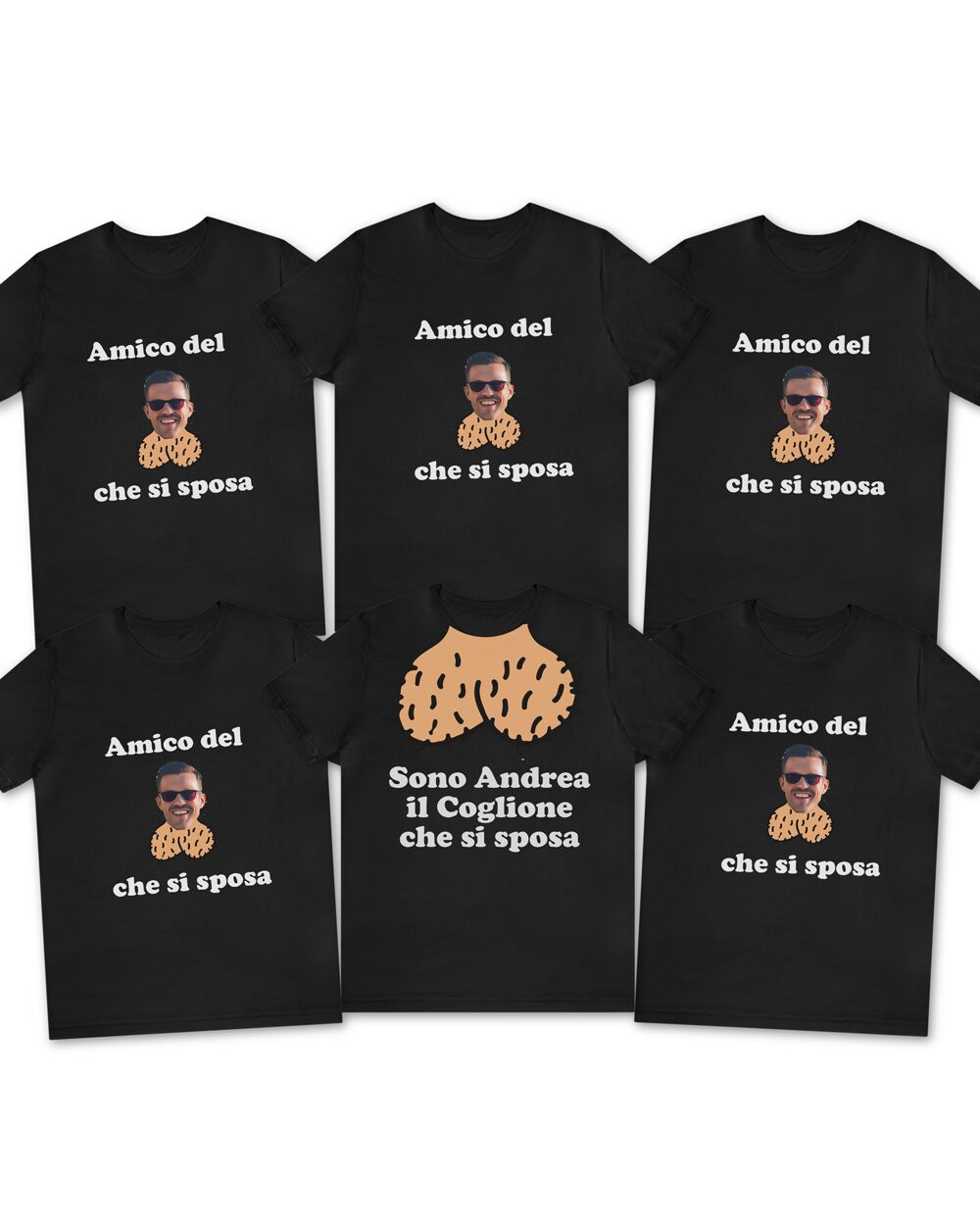 Il set funziona così: scegli la maglietta dello sposo con il suo nome e la frase iconica, poi decidi se aggiungere anche le magliette per gli amici. Ognuna di quelle degli amici riporta la foto dello sposo — la più imbarazzante che riesci a trovare, ovviamente — per creare un effetto comitiva assolutamente riconoscibile.