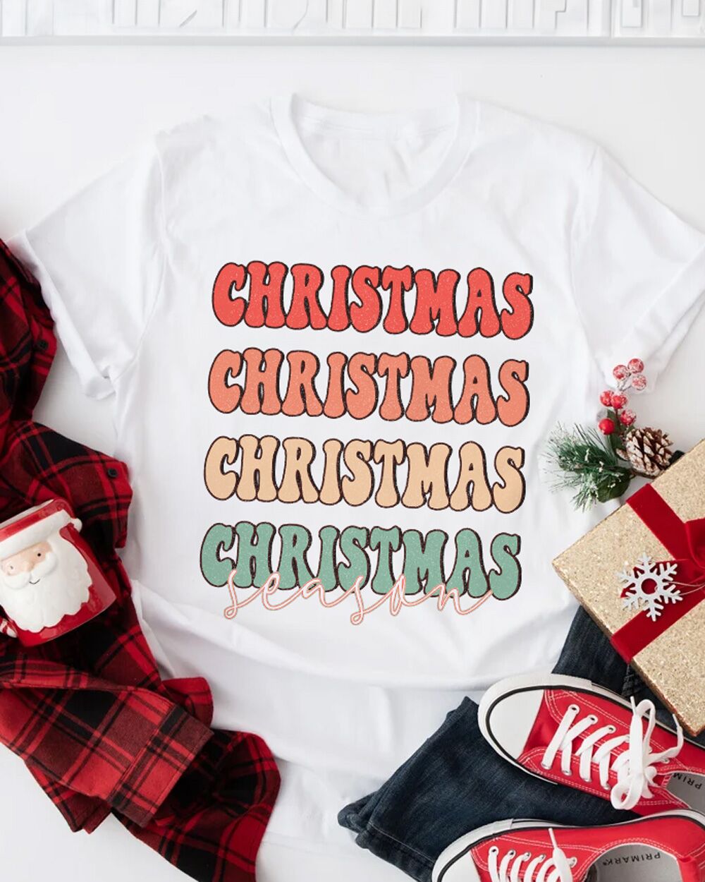 - Design festivo e accattivante: La scritta “Christmas Season” ripetuta in una combinazione di colori classici natalizi come rosso, verde e giallo aggiunge un tocco di allegria alla tua collezione di abbigliamento natalizio.
