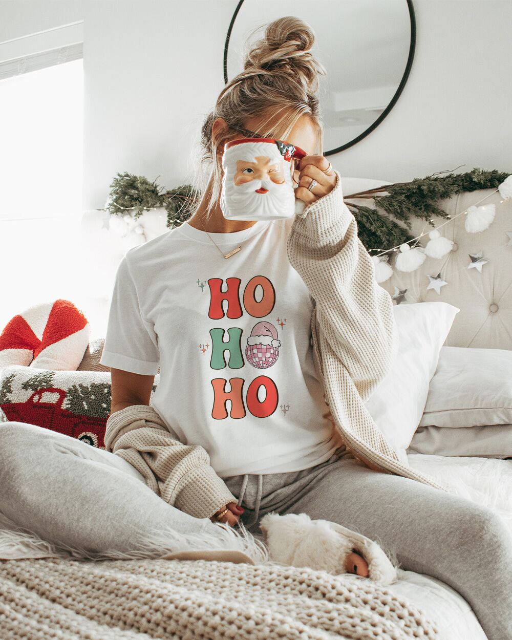 - Design festoso e vivace: La grafica “Ho Ho Ho” si distingue per i suoi colori allegri e la dolce aggiunta del cappello di Babbo Natale, abbinato a una sfera disco che aggiunge un tocco di brillantezza festiva. È perfetta per chi vuole celebrare il Natale con un tocco di originalità e divertimento, senza rinunciare a un look trendy.