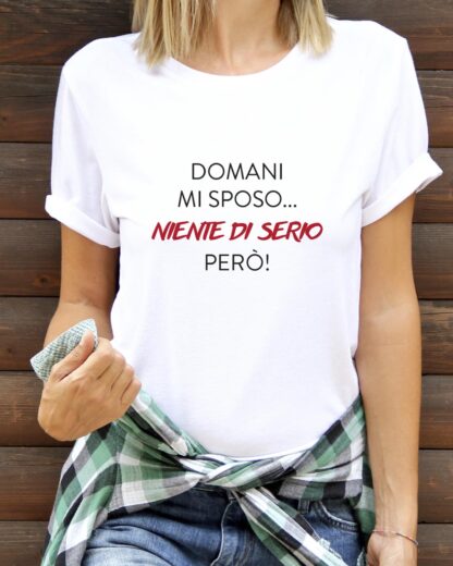 T-shirt personalizzata con la frase “Domani mi sposo… niente di serio però!”, ideale per l’addio al nubilato.