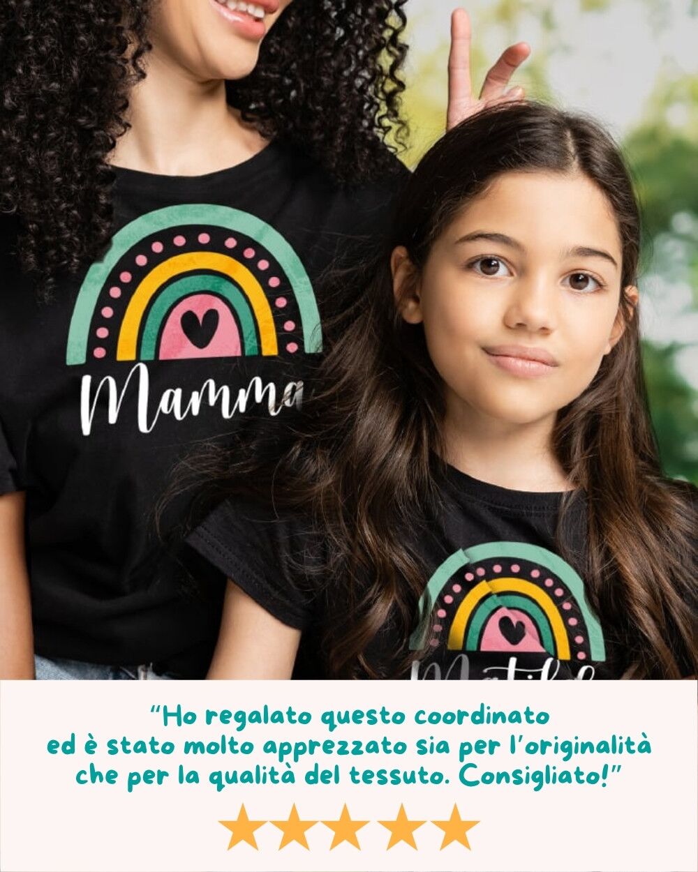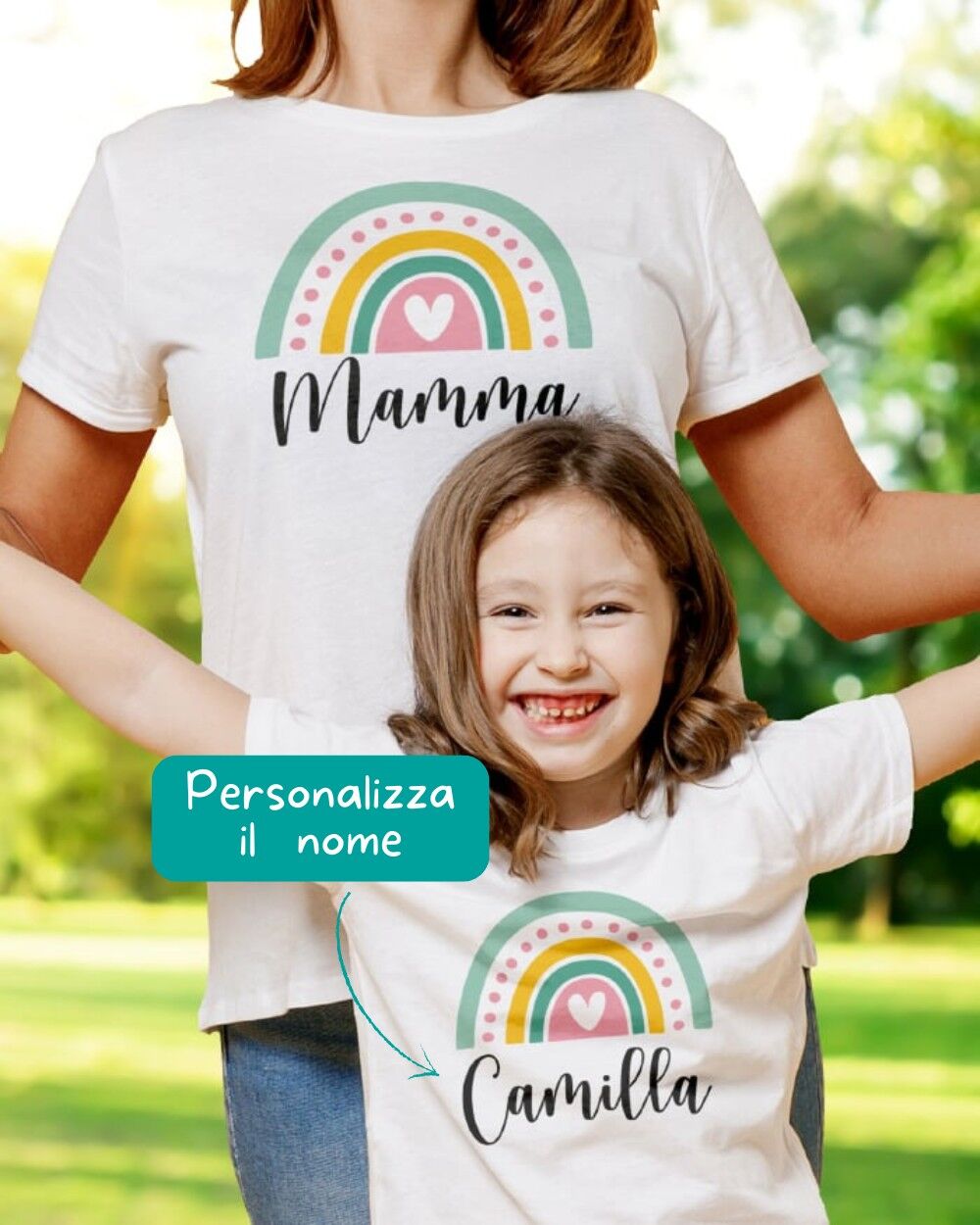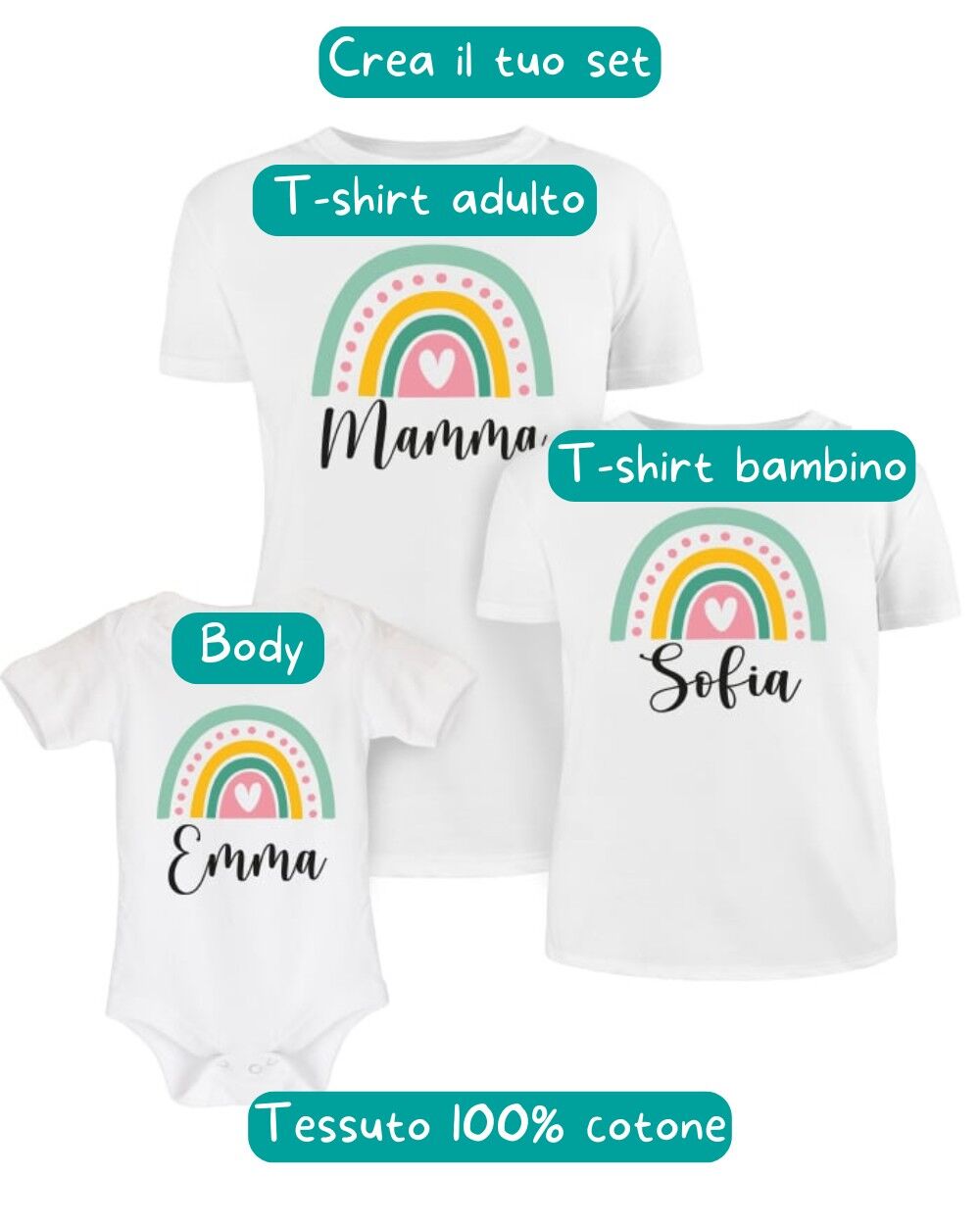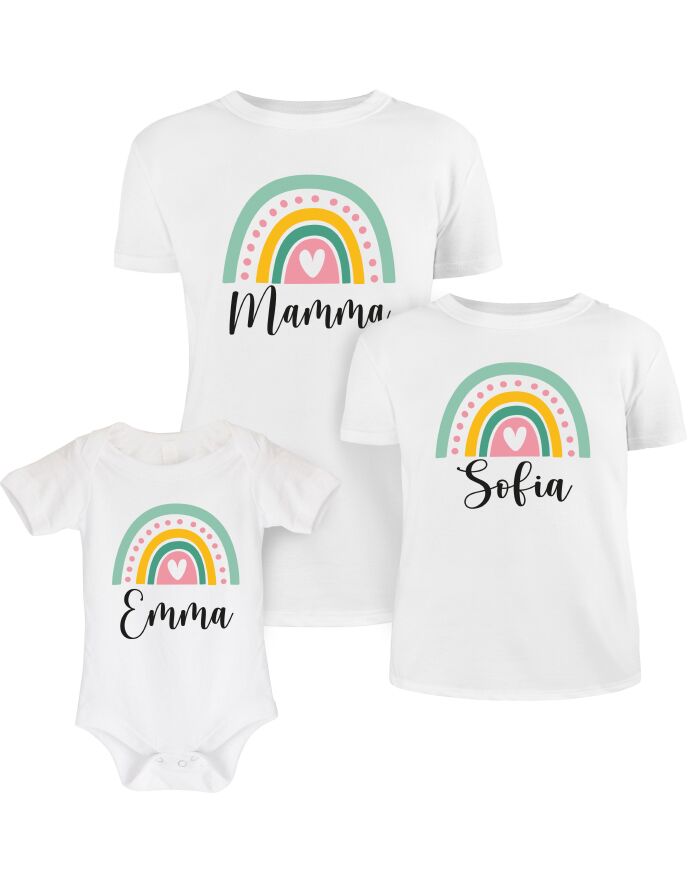 PERSONALIZZAZIONE: segui le indicazioni e personalizza il tuo coordinato con il nome della mamma e quello del bambino e crea un look davvero originale! La grafica dell’arcobaleno rimane standard.