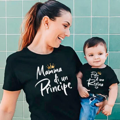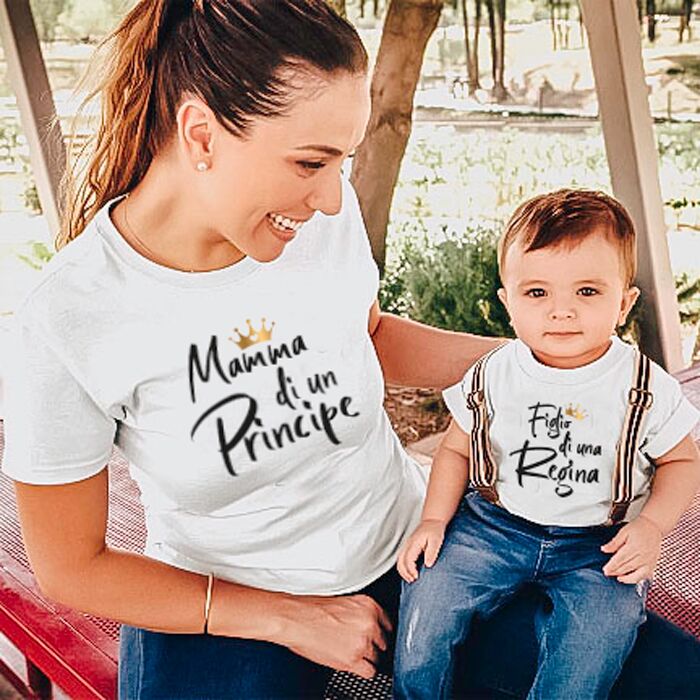 Bellissima coppia di magliette personalizzate per mamma e figlia o figlio con la scritta “Mamma di un Principe” e “Figlio di una Regina” Personalizzabile scegliendo le frasi da scrivere nelle due magliette, questa t-shirt sarà perfetta per tutte le super-mamme là fuori.