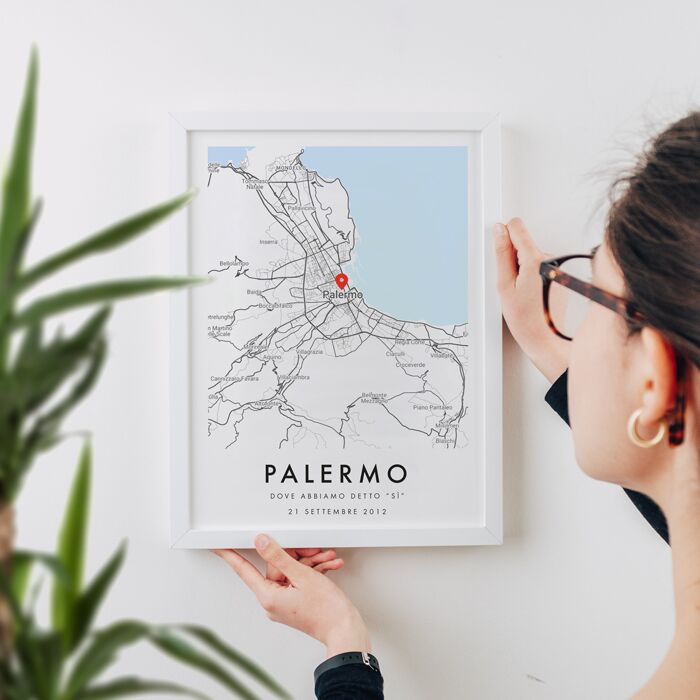 Questa stupenda mappa della città è perfetta per stupire il tuo lui o la tua lei in occasione del vostro anniversario o di San Valentino. Come funziona? Basta indicare la città che desideri e noi inseriremo la mappa corrispondente in questa stampa suggestiva e romantica.