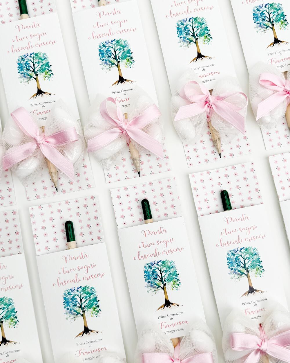 La Prima Comunione è un momento sacro e indimenticabile nella vita di un bambino. Per rendere questo evento ancora più speciale, le nostre matite piantabili personalizzate con dedica, nome, data e decori floreali rosa sono la scelta perfetta per una bomboniera che unisce creatività, bellezza e sostenibilità. Queste matite uniche non solo sono strumenti di scrittura utili, ma contengono anche semi che, una volta piantati, germogliano in splendide piante, simbolizzando la crescita spirituale e i nuovi inizi.