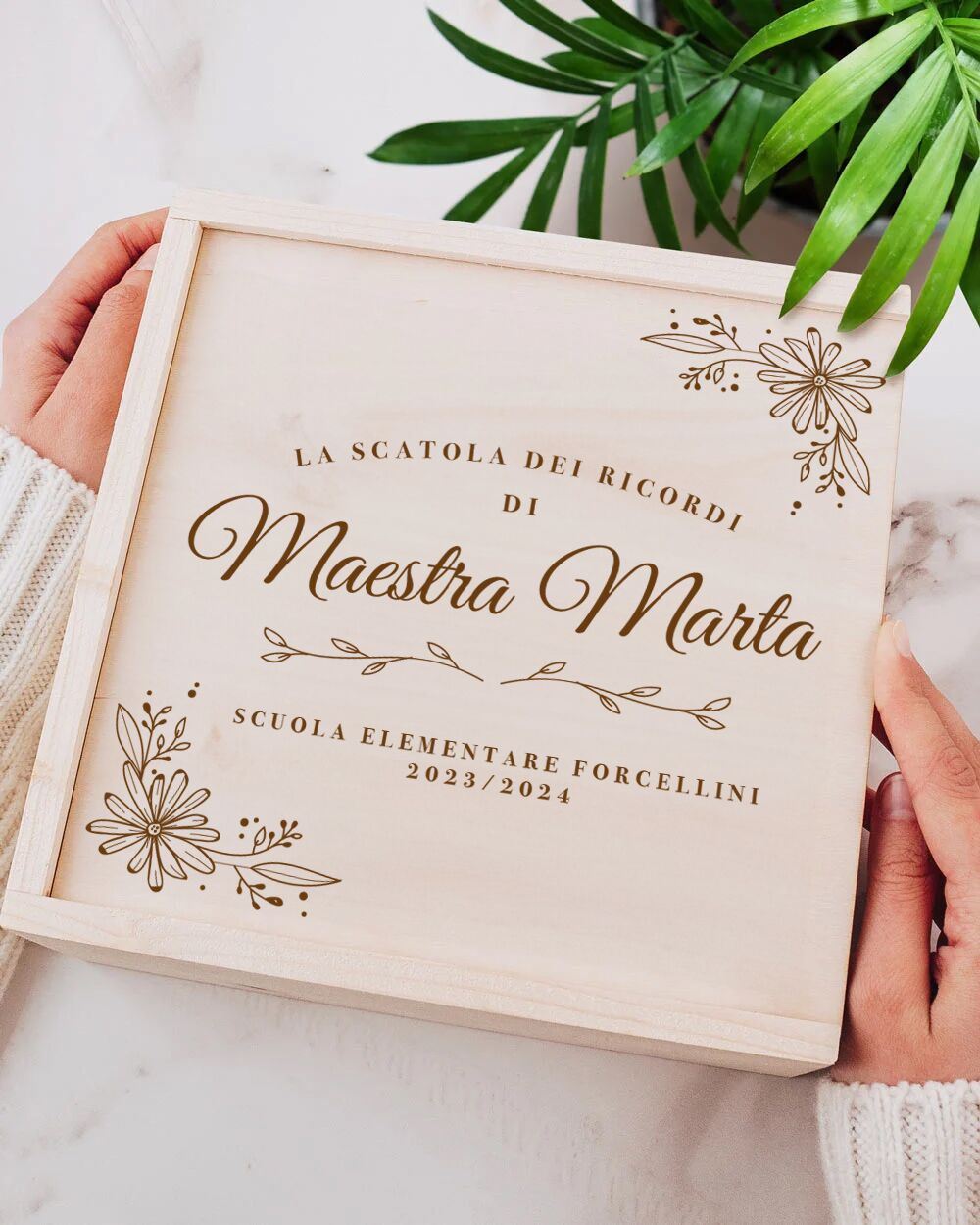 Al termine di un anno scolastico denso di esperienze e momenti indimenticabili, cosa c’è di meglio di un regalo che permetta di conservare quei ricordi? La nostra Memory Box per Maestre, arricchita da dettagli botanici e personalizzazione del nome, è la scelta perfetta per offrire un rifugio sicuro e affettuoso a tutti quei piccoli grandi momenti vissuti in classe.