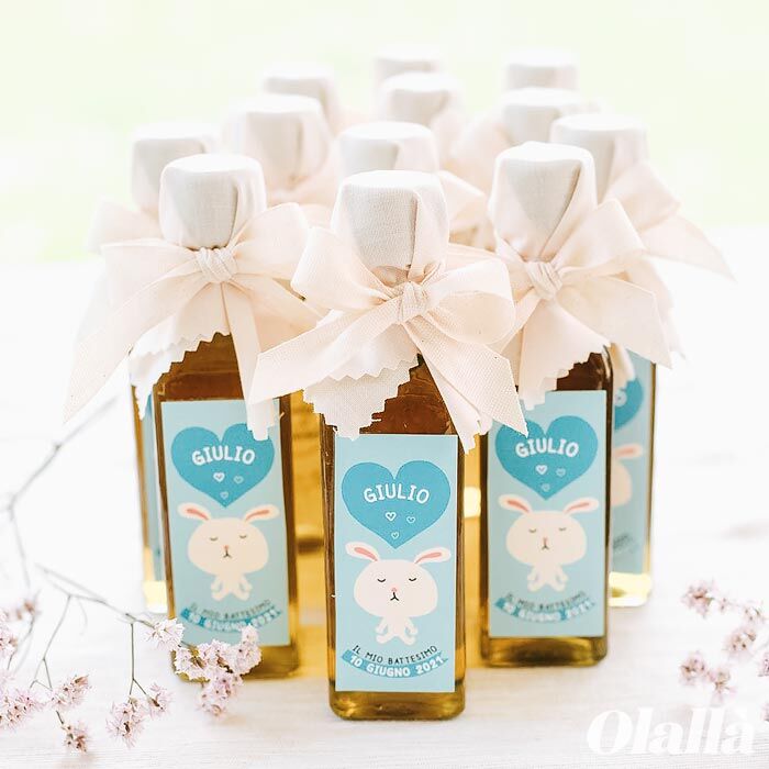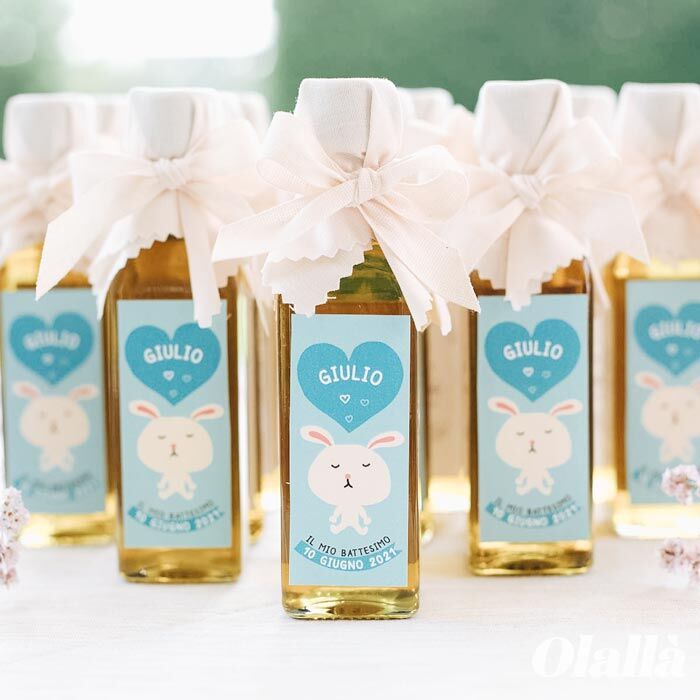 Tenere mini bottigliette di olio extra vergine d’oliva adatte come bomboniera per il Battesimo, la Cresima, la Comunione, il Matrimonio o qualsiasi grande evento. Personalizza l’etichetta come desideri scegliendo un tenero animaletto tra quelli proposti, aggiungi il nome del bambino ed una dedica! 100% Olio Italiano.