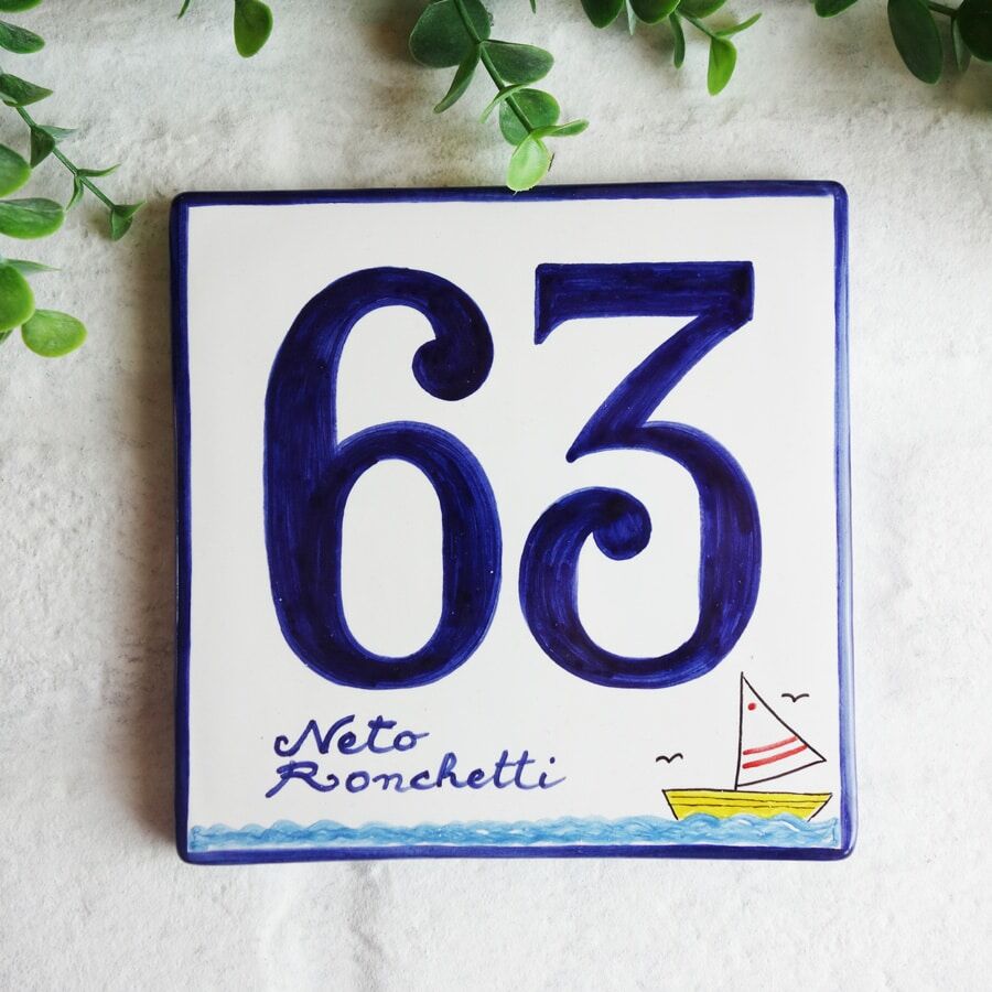 Formella in ceramica, 100% made in Italy, di ottima qualità. E’ un prodotto molto resistente, infatti potete appenderlo fuori da casa vostra, anche all’esterno, pioggia, sole o intemperie non rovineranno la nostra piastrella, che gode di una garanzia ventennale. Il logo con la barchetta e il mare dipinti a mano sulla formella, la rende perfetta per la vostra casa delle vacanze, se ne avete una, o se abitate in una località marittima. E’ interamente lavorata e dipinta a mano, per un ingresso di casa in stile marittimo tutto da invidiare. Potete personalizzarlo come preferite, scegliendo il colore, la calligrafia, e volendo sostituendo o aggiungendo al numero civico nome di famiglia, via o quello che più preferite.