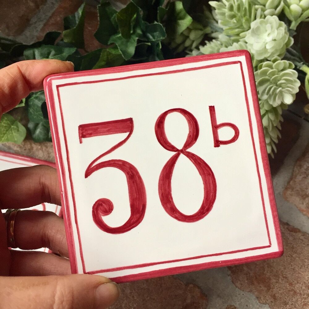 Formella con l’indicazione del vostro numero civico e, se volete, della via, comune o nome di famiglia. E’ un numero civico in ceramica che vi durerà almeno 20 anni: resistenza garantita contro il gelo, sole ed intemperie. I colori potrebbero variare leggermente da quelli presenti in foto, a seconda della luce e del tipo di schermo.