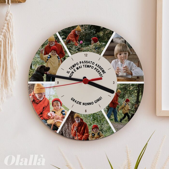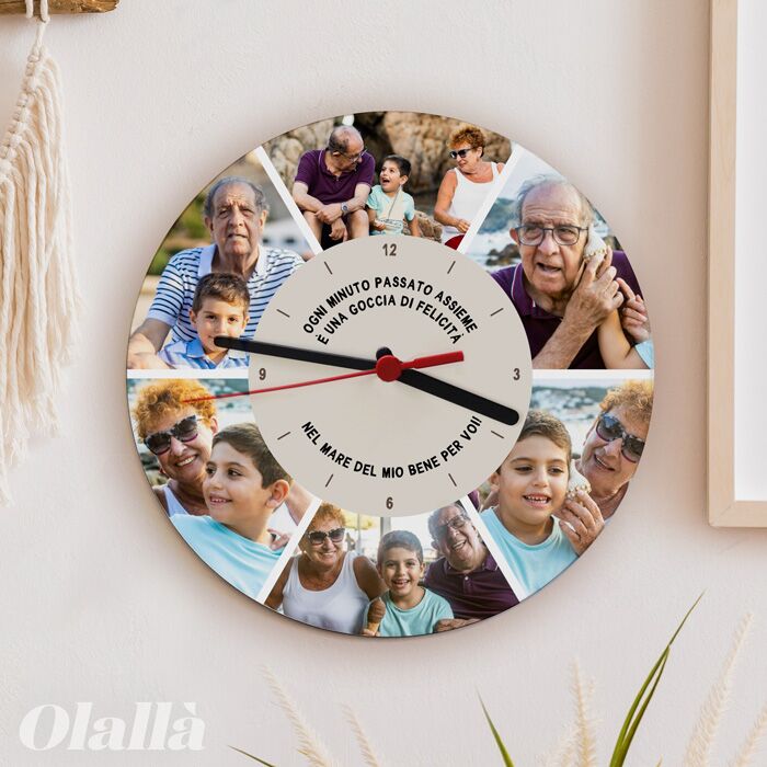 Orologio personalizzato con le tue foto ed una dedica speciale. Ideale per realizzare un regalo originale e sentito ai tuoi nonni, genitori o persone più care. Scegli 6 tra le tue foto più belle, trova una frase che rispecchi l’emozione che vuoi condividere ed ecco fatto, il tuo bellissimo orologio sarà consegnato a casa tua in pochi giorni. Funziona con batterie non incluse nel prezzo.