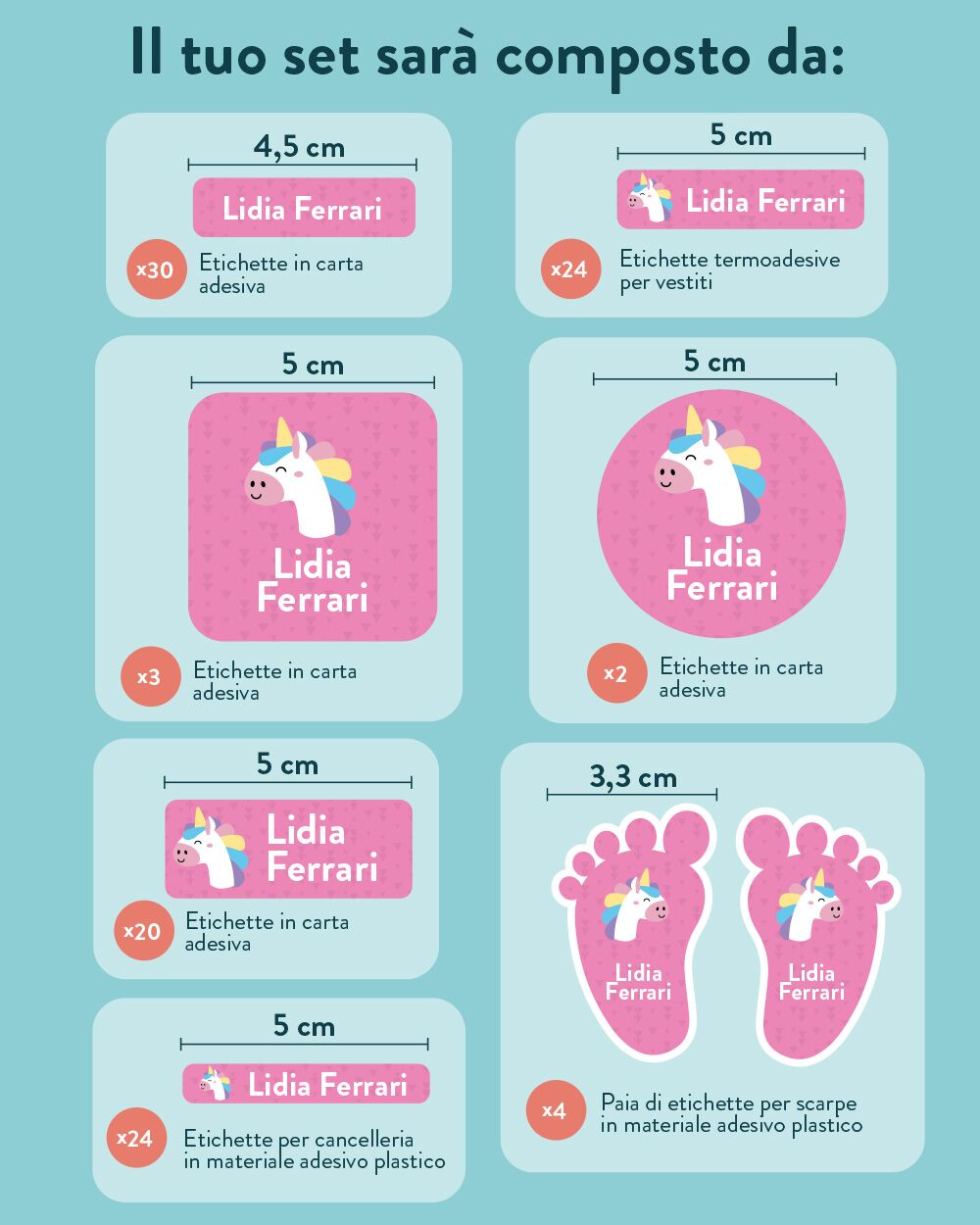 - Applicazione: applicabili sulle etichette degli abiti o direttamente sui tessuti (etichette termoadesive) oppure sul materiale scolastico (etichette adesive).