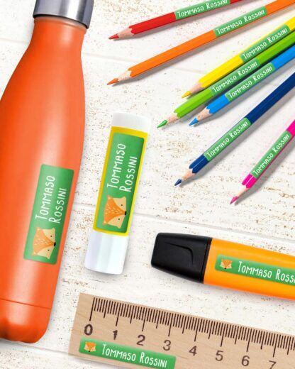- Etichette adesive rettangolari in materiale plastico ultra resistente per oggetti scolastici personalizzabili con nome e simbolo.