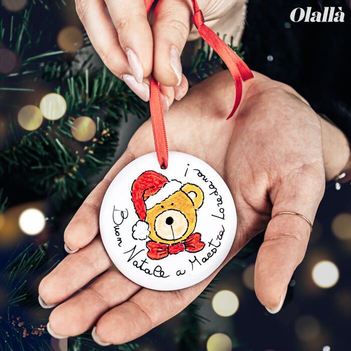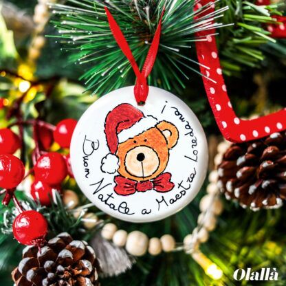 Pallina per albero in ceramica dipinta a mano con frase e simpatico orsacchiotto. Un regalo speciale ed originale da fare alla maestra, alla tua amica o all’amichetto del cuore questo Natale.