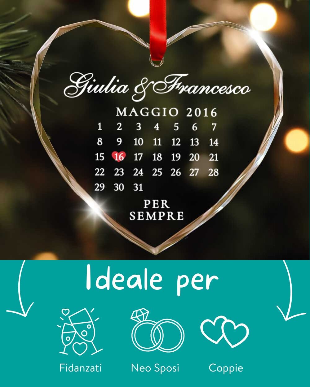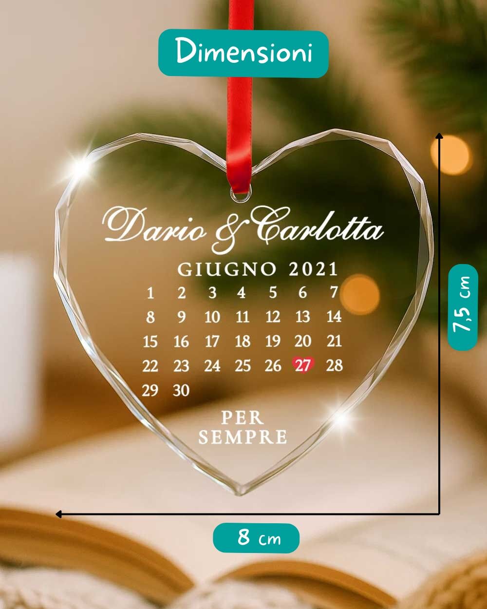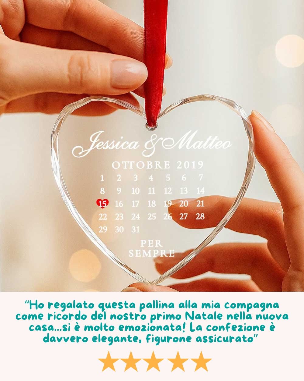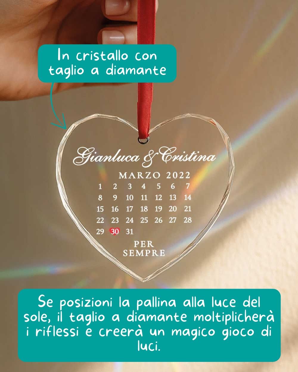La Pallina di Natale in Cristallo a Cuore con Taglio a Diamante, personalizzata con calendario, nomi e dedica, è una di quelle idee che lasciano il segno.