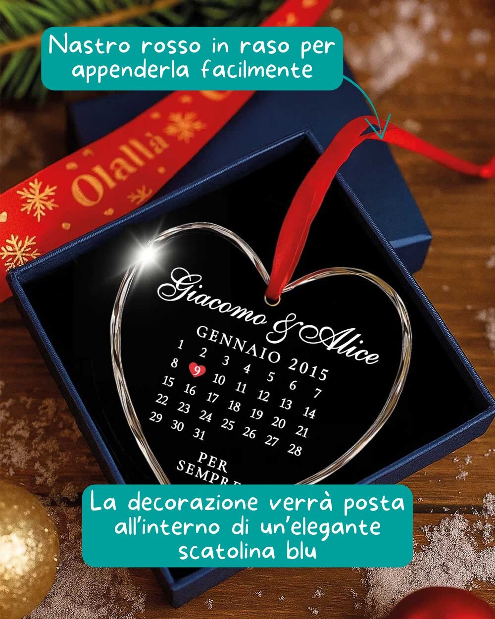 Pallina di Natale in Cristallo a Cuore, Taglio a Diamante – Decorazione Natalizia Personalizzata con Calendario e Nomi – Idea Regalo Natale Coppia