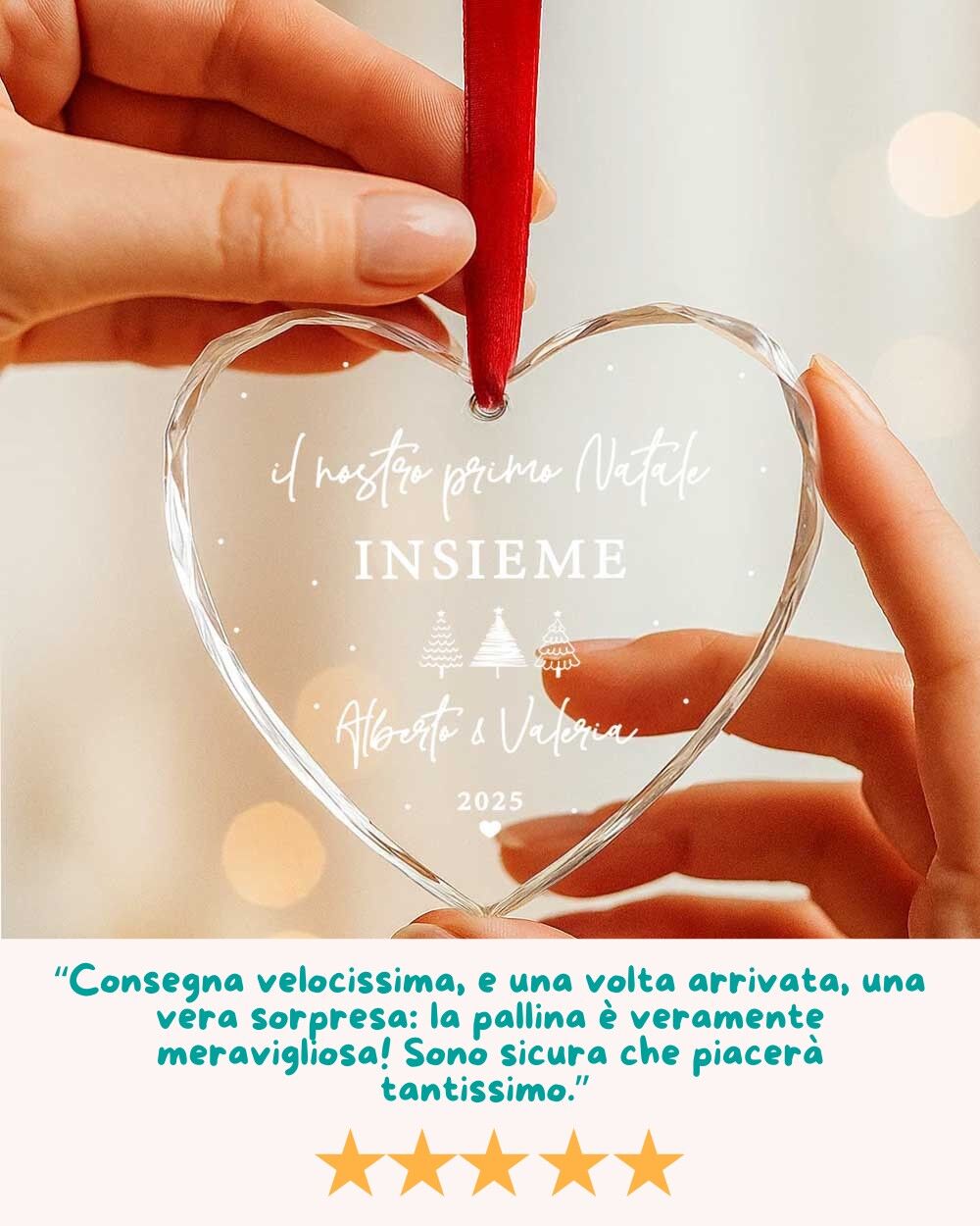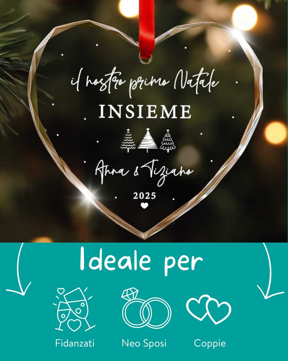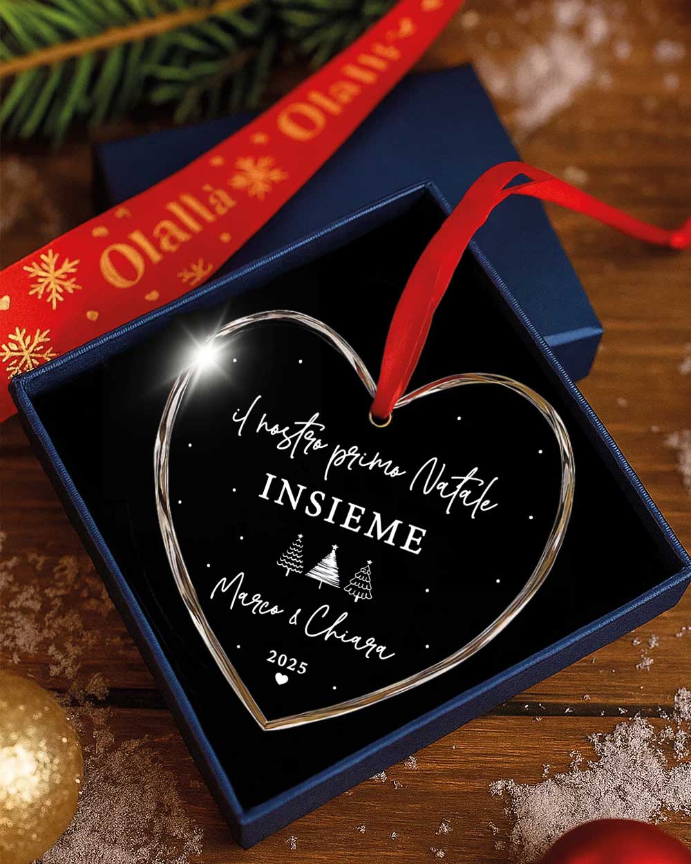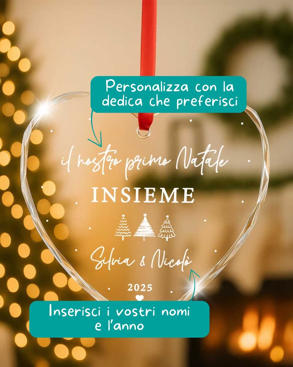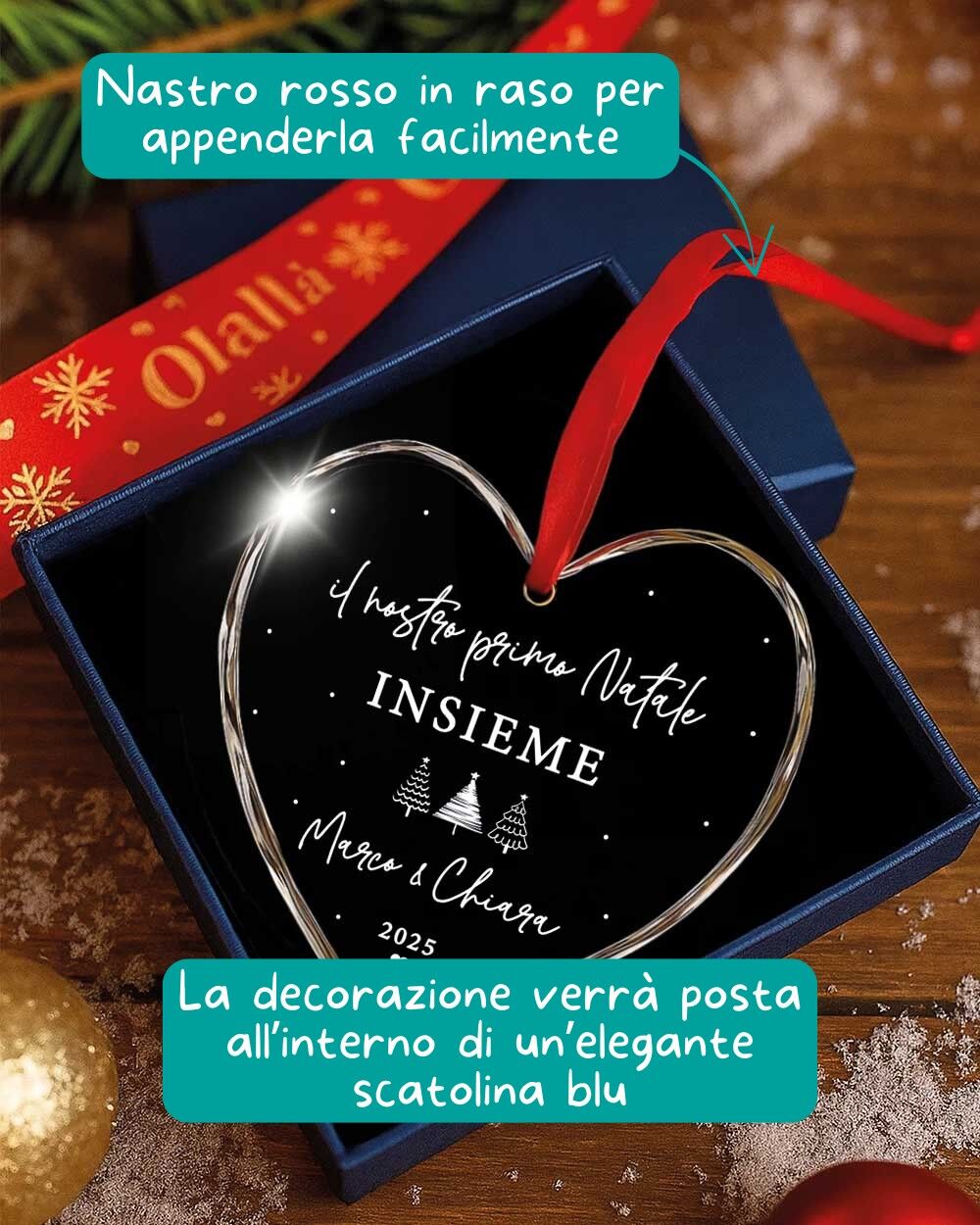 - La frase “Il nostro primo Natale insieme” o una dedica breve a scelta;