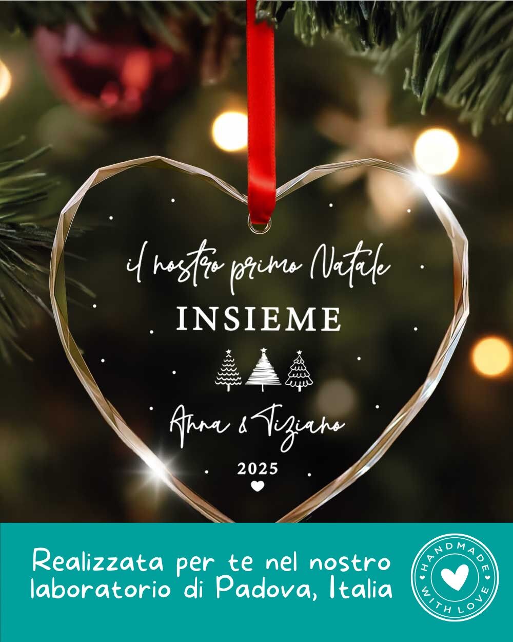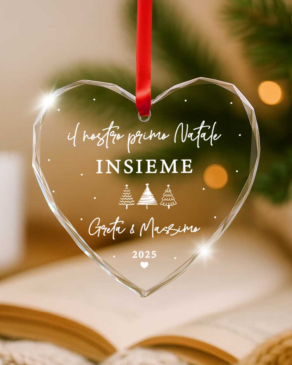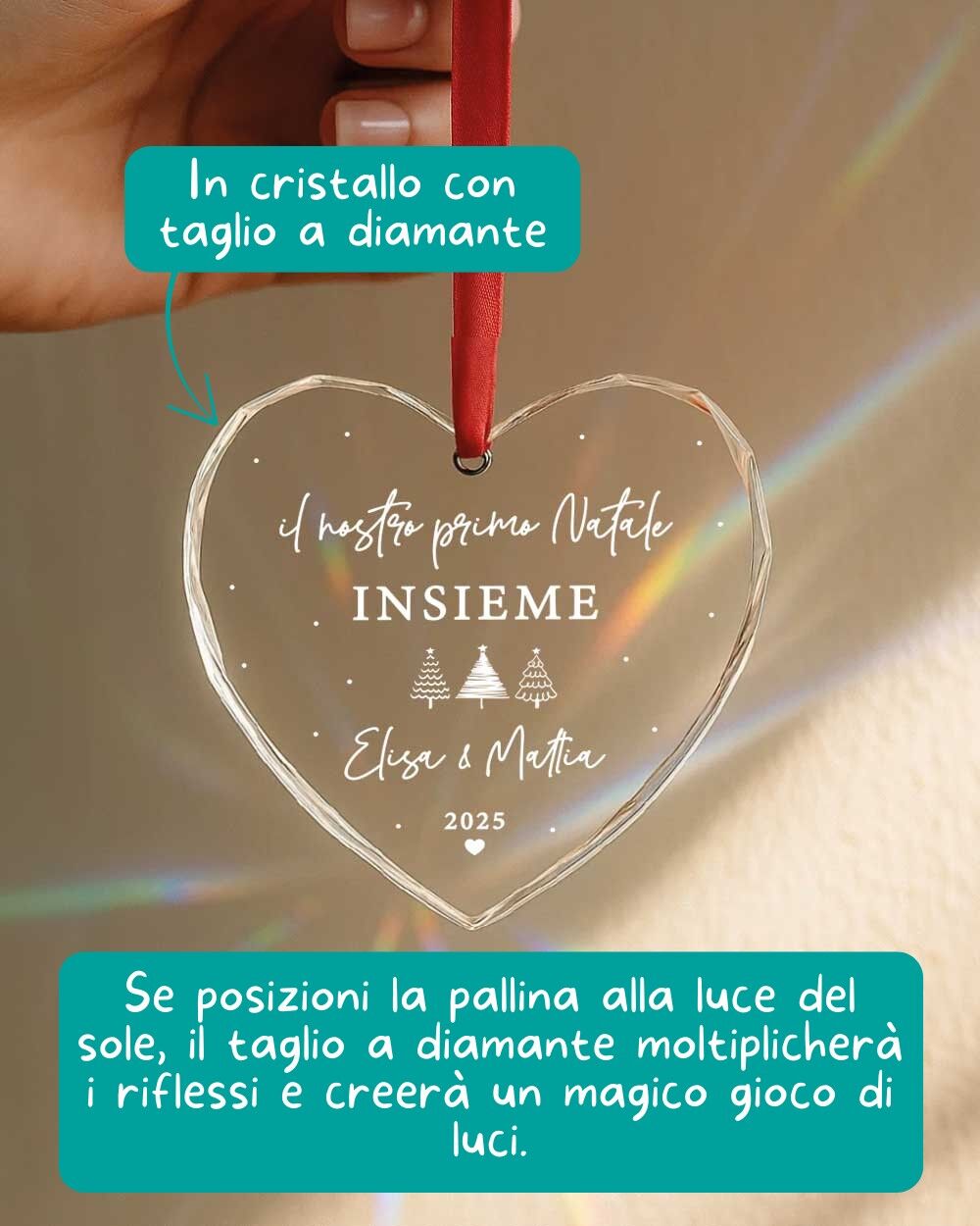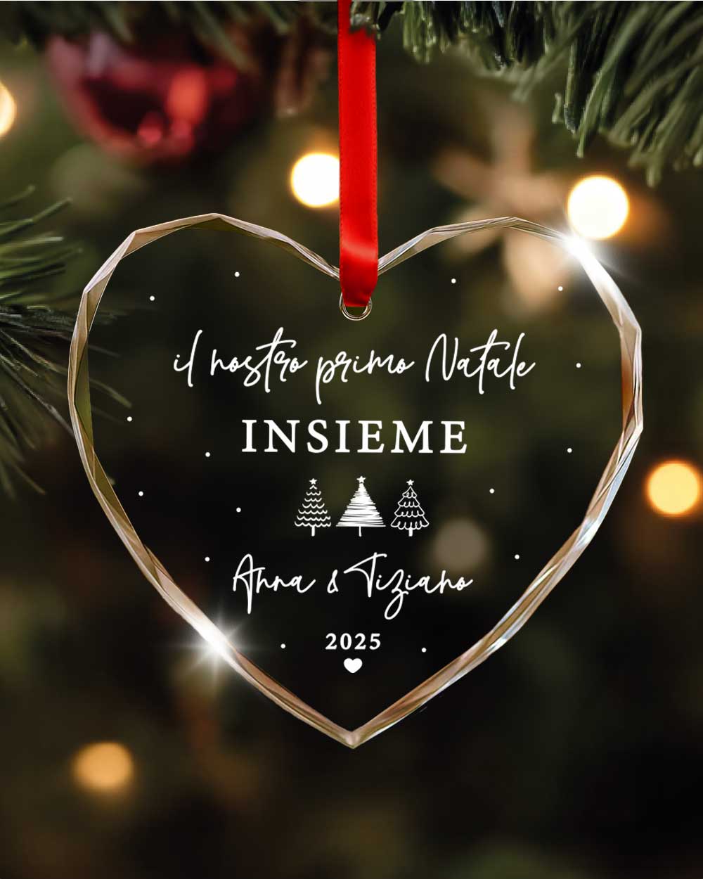Per rendere indimenticabile questo momento, nasce la Pallina di Natale in Cristallo a Cuore con Taglio a Diamante, personalizzata con la scritta “Il nostro primo Natale” e i nomi della coppia.