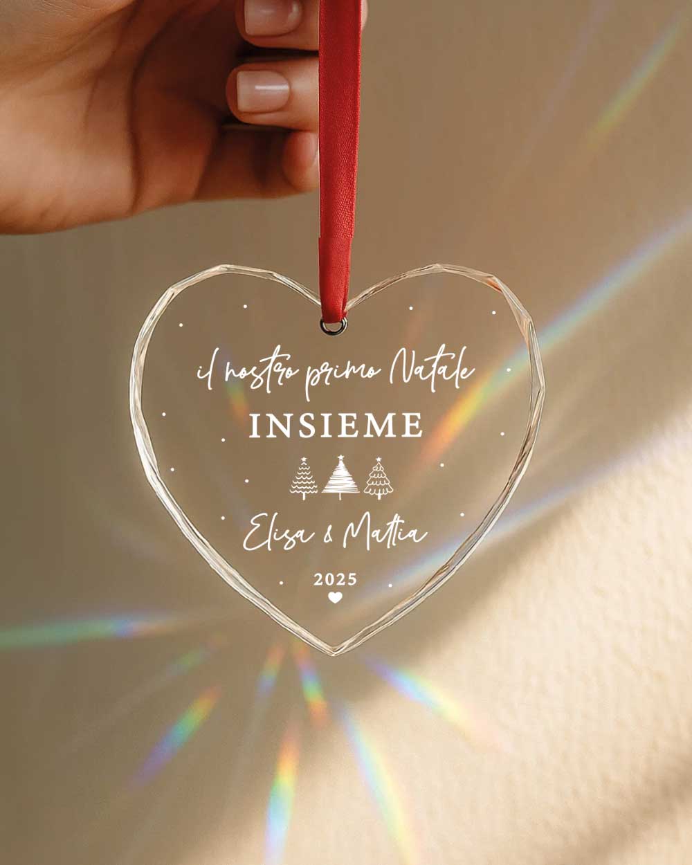 Il cuore in cristallo viene poi impreziosito dal nastro rosso in raso, pronto per essere appeso all’albero o conservato come ricordo prezioso di un momento speciale.