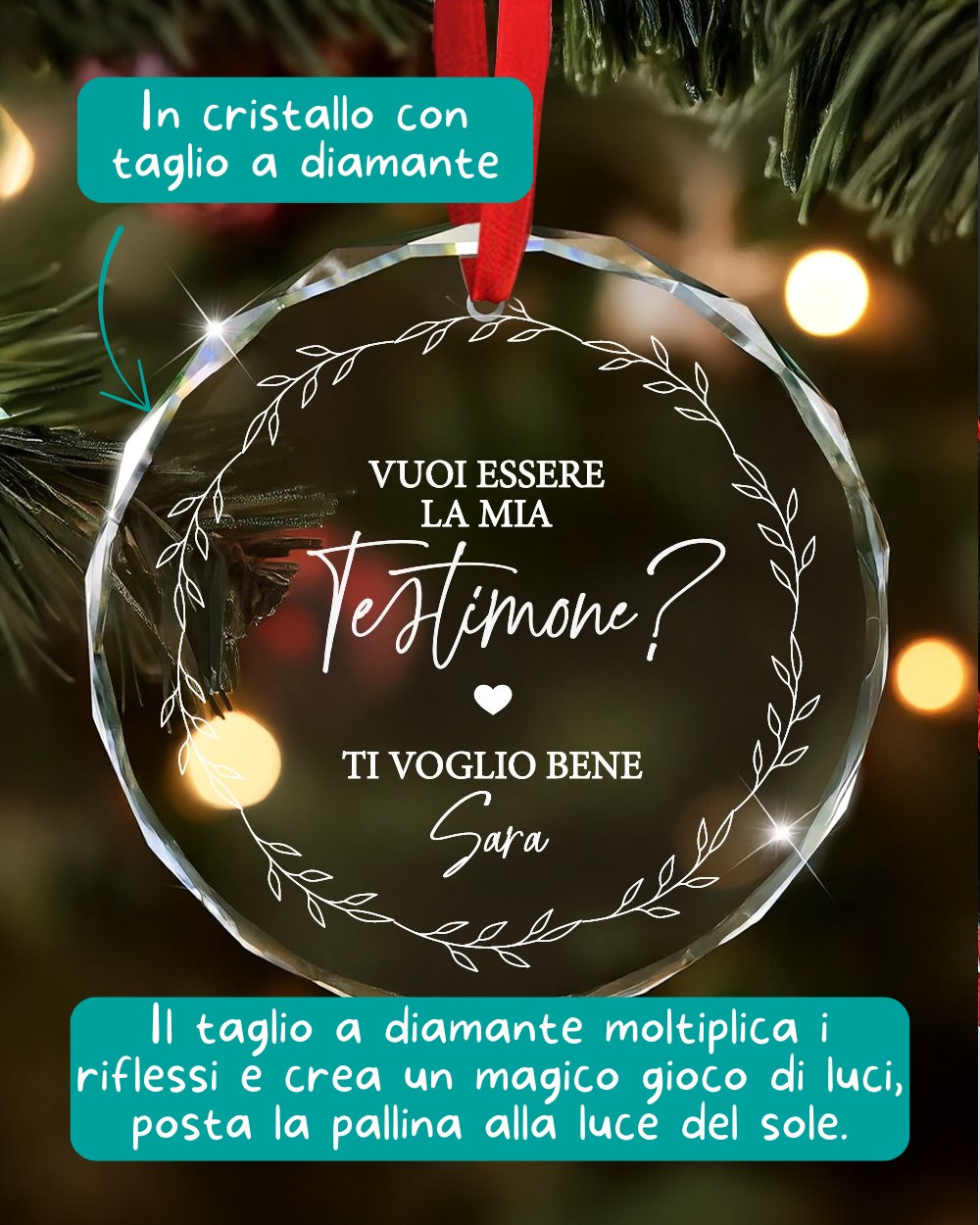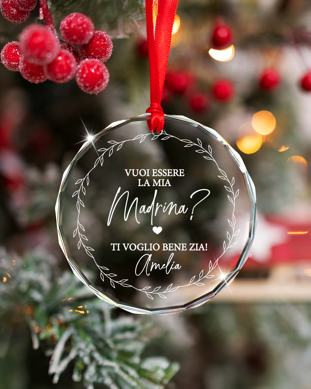 La stampa, realizzata con la massima precisione, garantisce un risultato raffinato, nitido e indelebile nel tempo. La ghirlanda botanica incornicia la scritta con eleganza naturale, mentre il taglio a diamante riflette la luce in modo spettacolare, donando alla pallina di Natale personalizzata un effetto scintillante e prezioso.