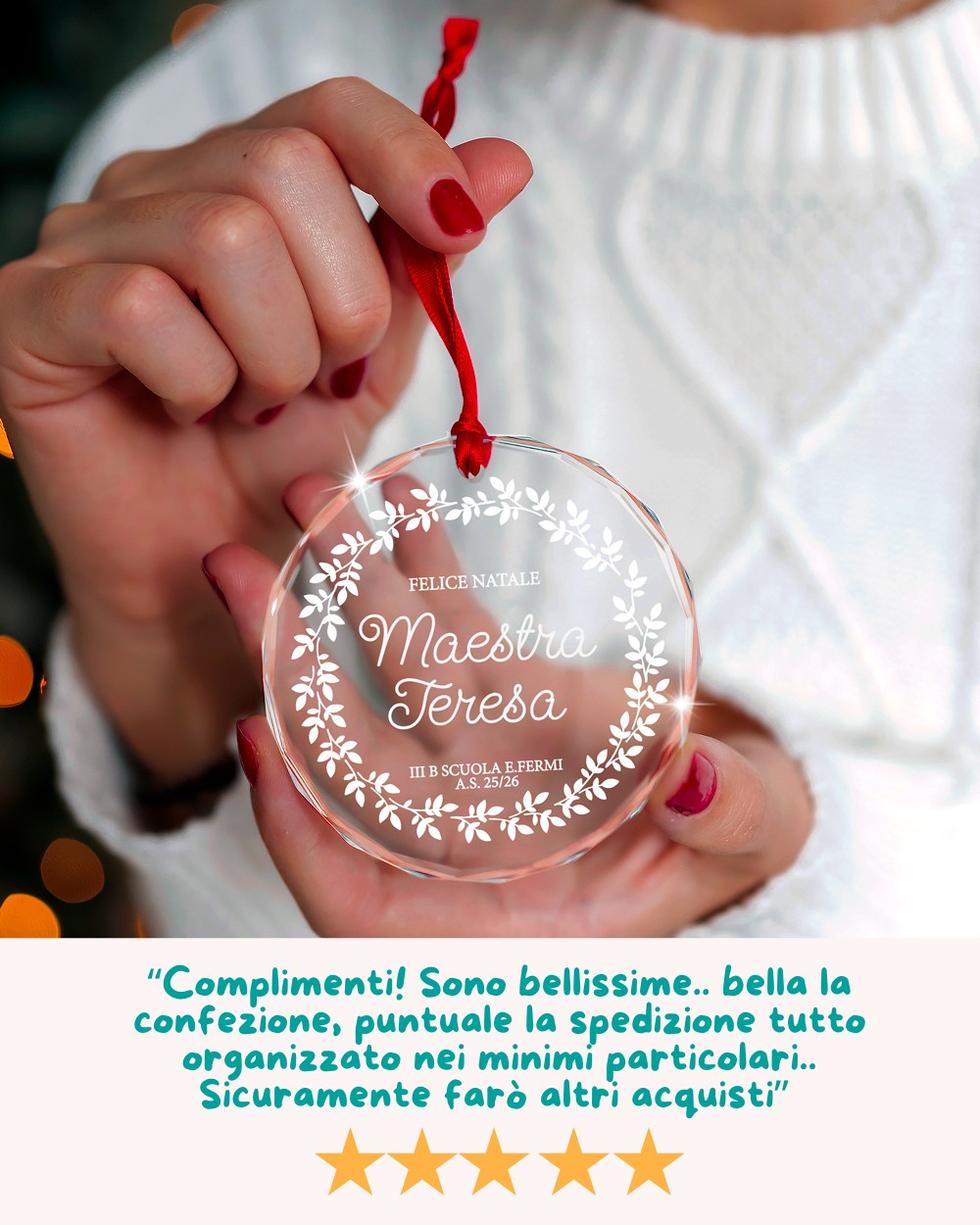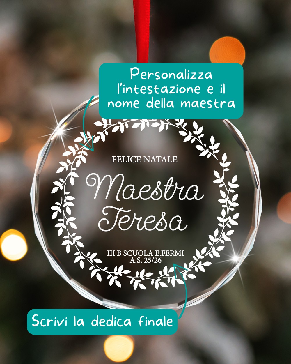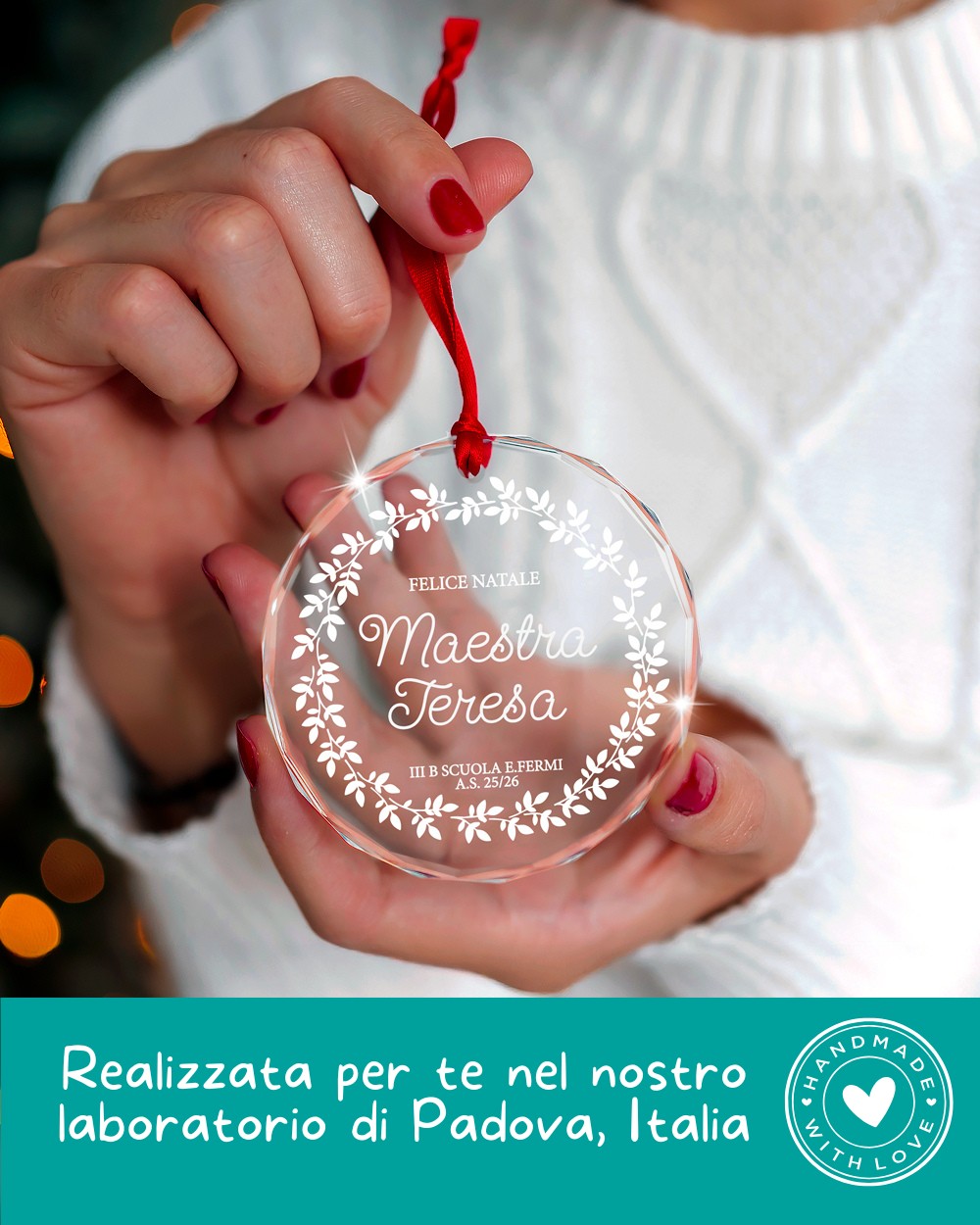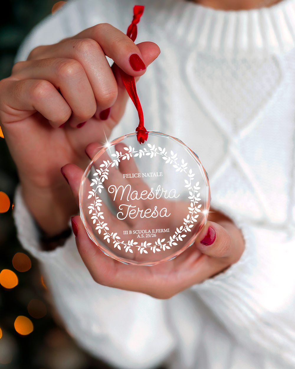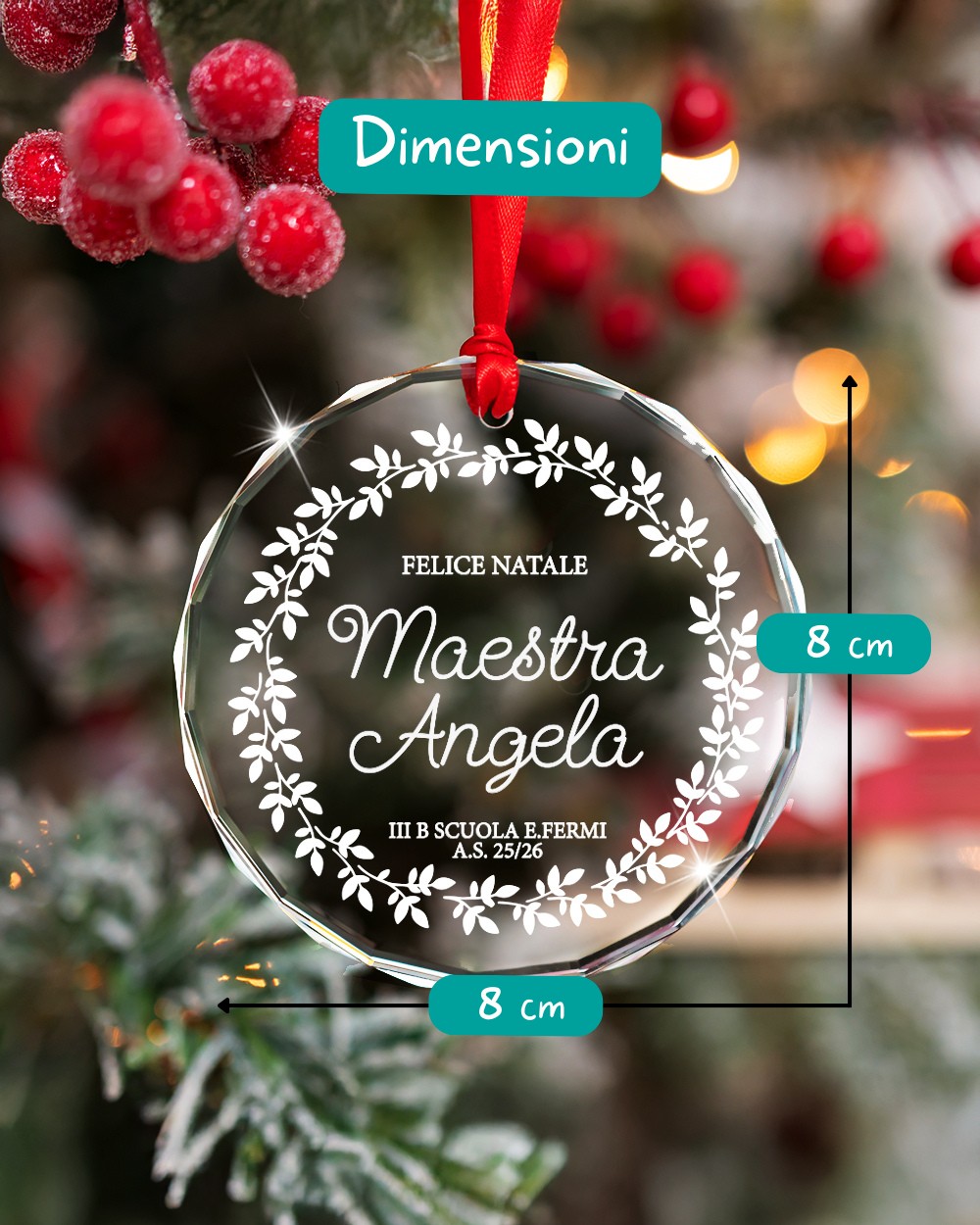Il taglio a diamante moltiplica i riflessi della luce, rendendo questa pallina di Natale personalizzata un vero capolavoro di eleganza e luminosità. Appesa all’albero o esposta su una mensola, la decorazione sarà un ricordo prezioso che farà sorridere la maestra ogni Natale.