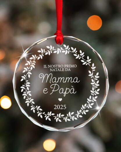 La stampa viene realizzata con tecnologia di alta precisione nel nostro laboratorio di Padova, per un risultato elegante, nitido e indelebile. La ghirlanda di foglie incornicia la scritta in modo armonioso, mentre il taglio a diamante del cristallo amplifica i riflessi della luce, rendendo questa decorazione natalizia luminosa e raffinata. Appesa tra le luci dell’albero o posizionata in un angolo speciale della casa, questa pallina di Natale personalizzata diventerà un simbolo di famiglia, amore e ricordi preziosi.
