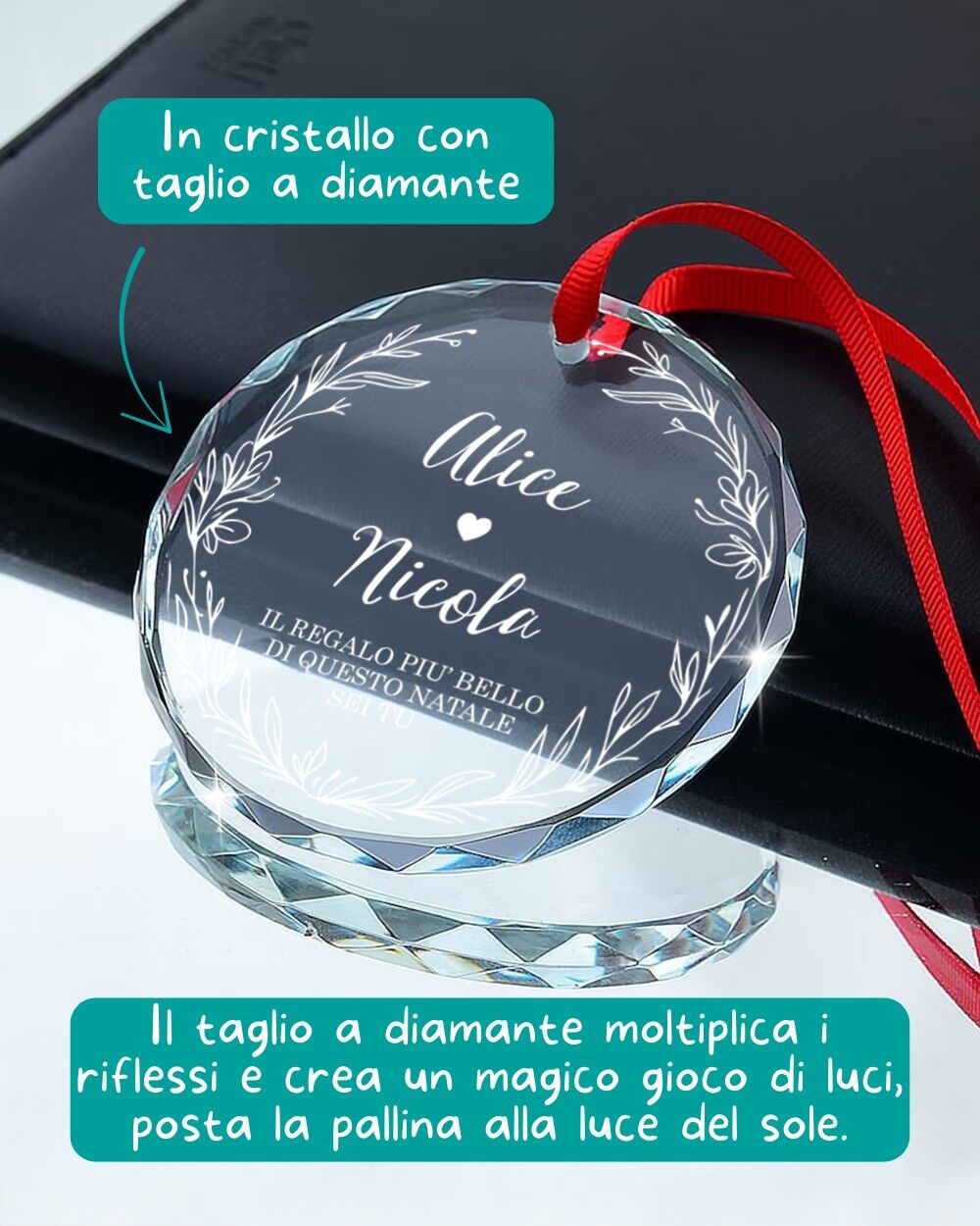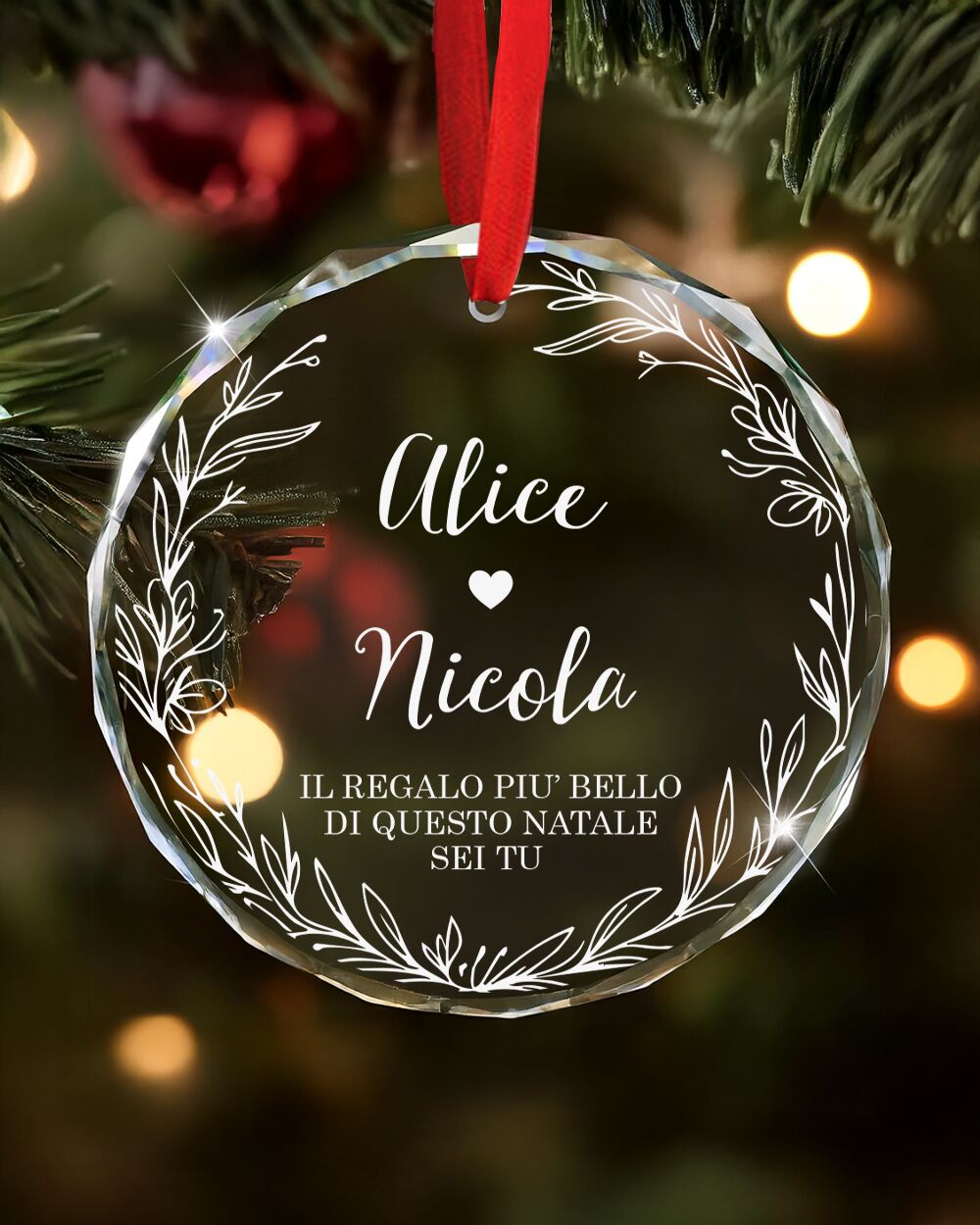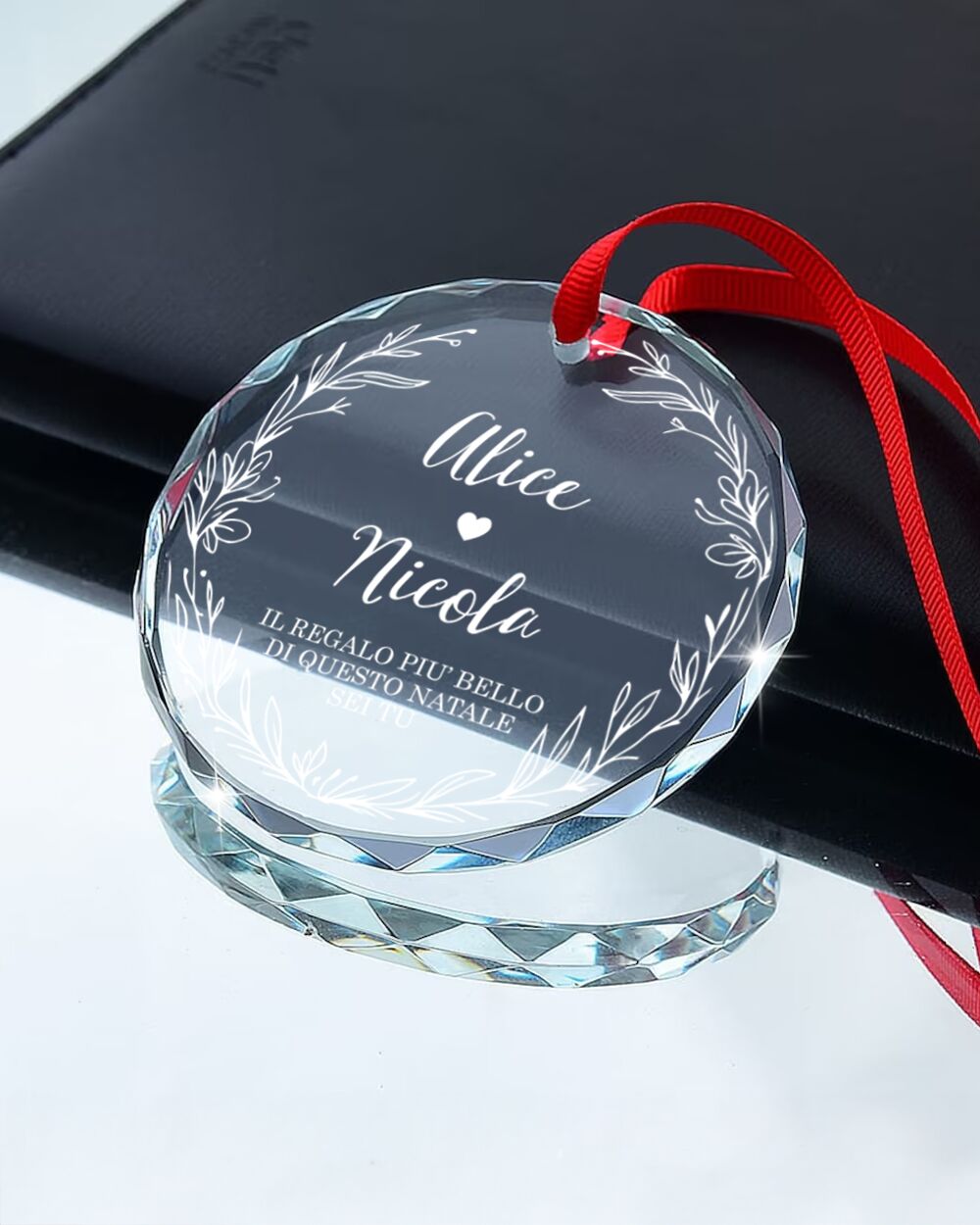 La ghirlanda floreale incornicia il testo con un tocco delicato e armonioso, mentre il taglio a diamante del cristallo amplifica i riflessi della luce, rendendo la pallina brillante e suggestiva. Appesa all’albero, questa decorazione in cristallo cattura ogni bagliore, creando un gioco di luce che illumina l’ambiente e scalda il cuore.