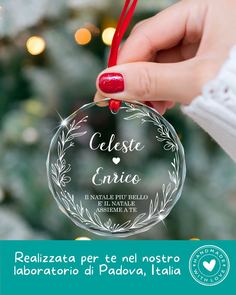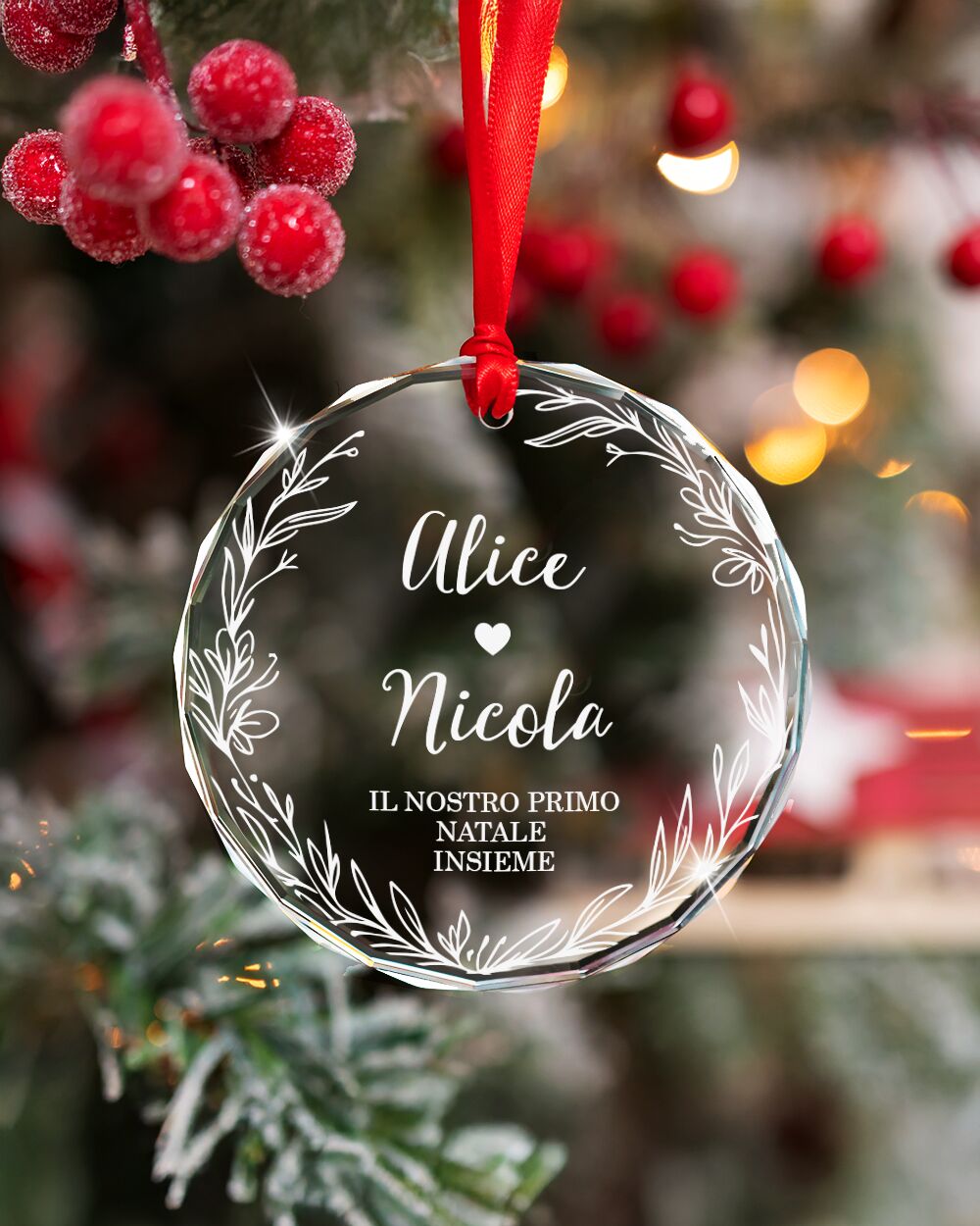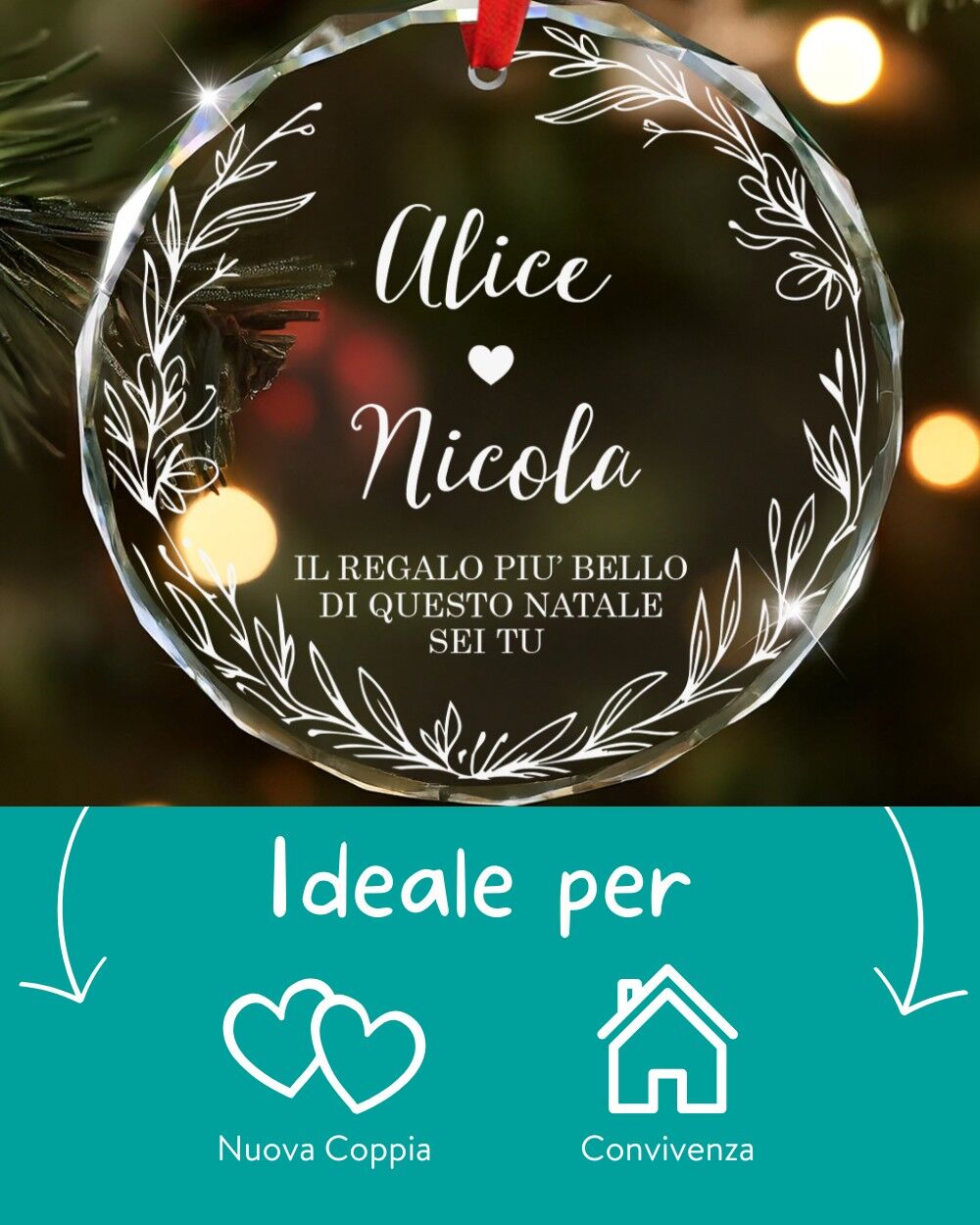 Questa pallina di Natale personalizzata è una splendida idea regalo di Natale per coppia o nuova casa, pensata per celebrare l’amore, i nuovi inizi e i momenti speciali.