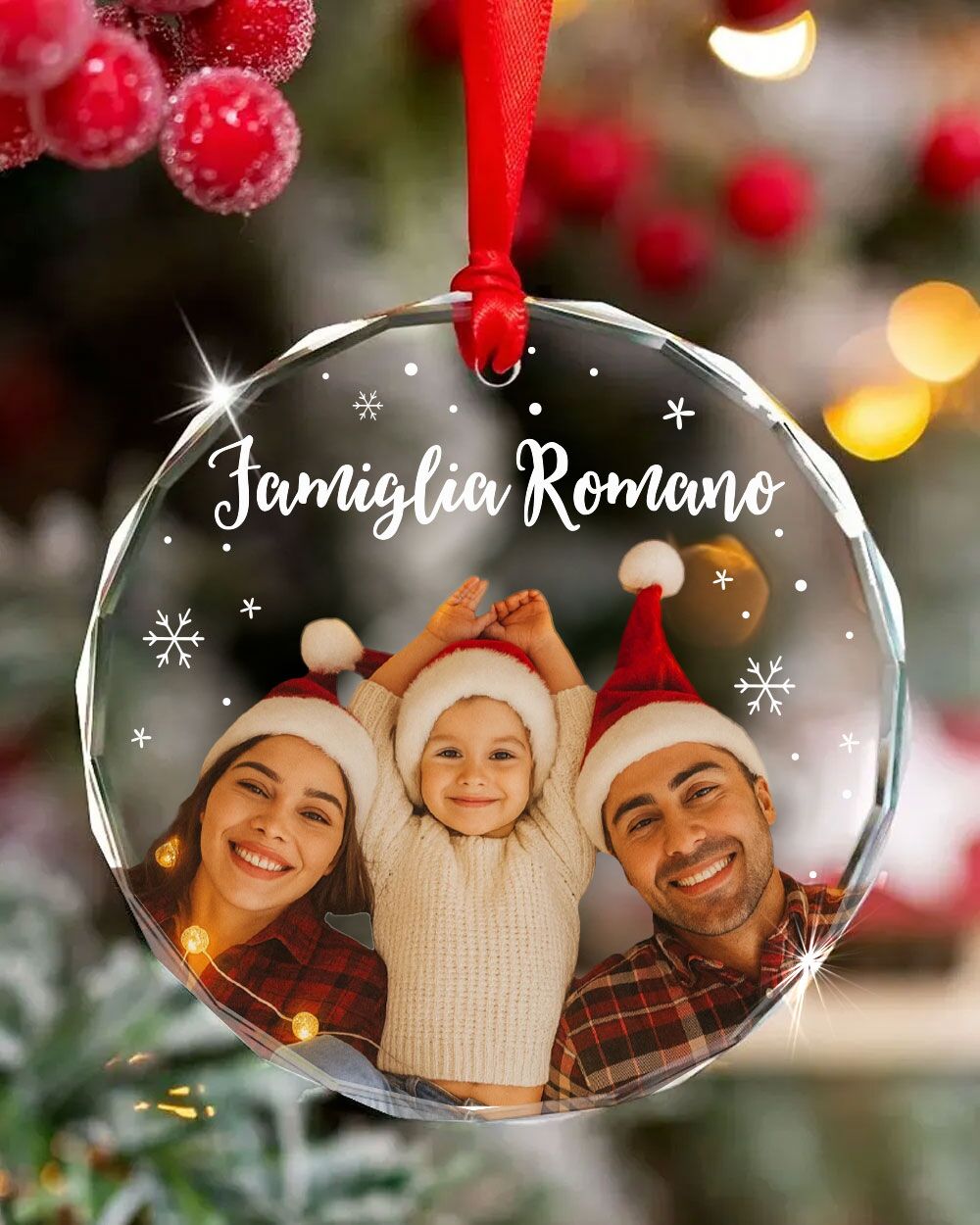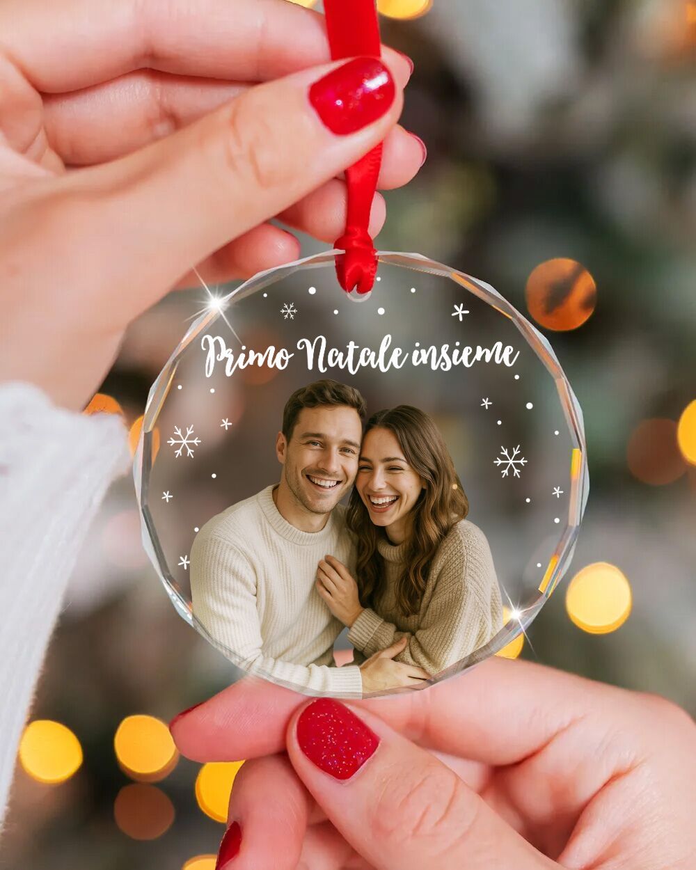 La stampa è nitida, brillante e perfettamente integrata nel cristallo. Grazie al taglio a diamante, la pallina riflette la luce e mette in risalto ogni dettaglio della fotografia. È una decorazione per l’albero che non passa inosservata e che racconta una storia unica: la tua.